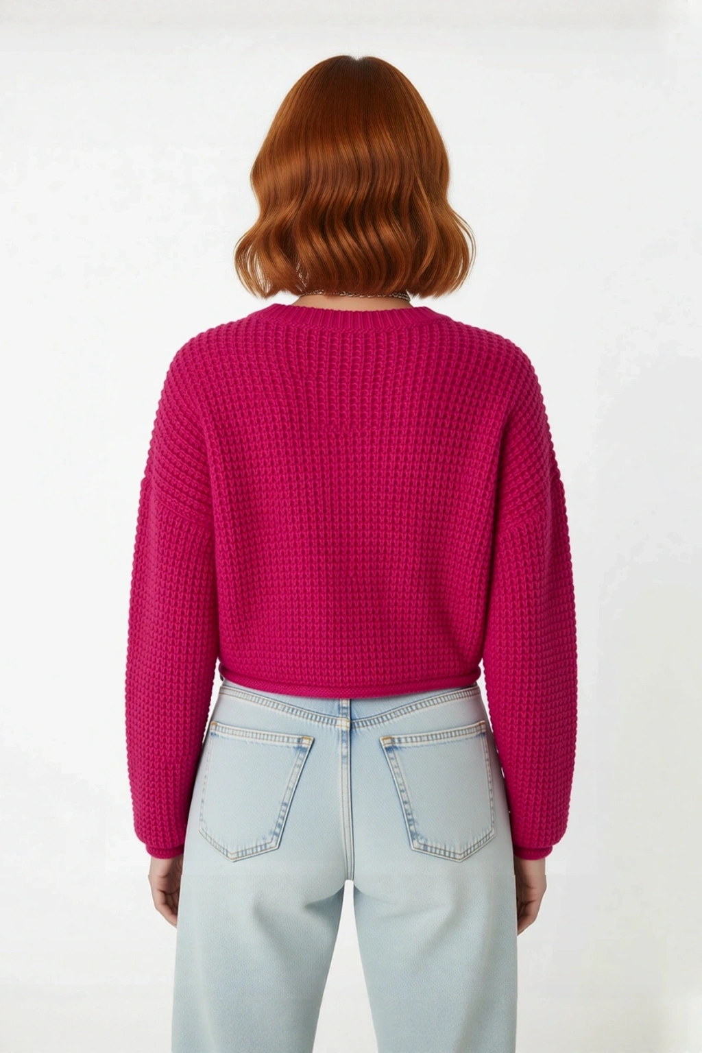Ürün Özellikleri: Oversize kalıp, akrilik materyal, dokulu desen, bisiklet yaka, uzun düşük kol, triko kumaş, pembe renk.