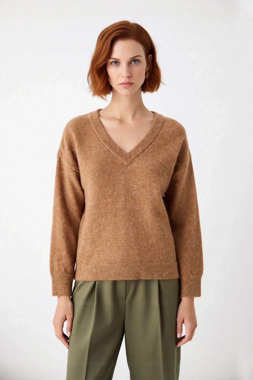 Ürün Özellikleri: Oversize kalıp, triko kumaş, düz desen, V yaka, düşük kol, orta kalınlık, bej renk.
