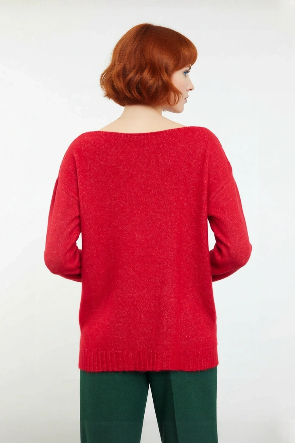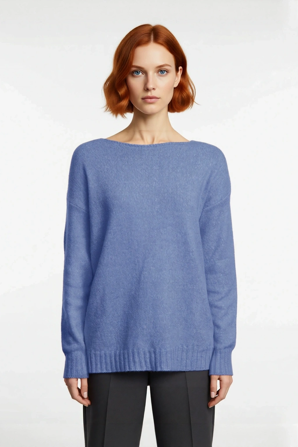 Ürün Özellikleri: Oversize kalıp, akrilik polyester yün materyal, düz desen, kayık yaka, standart kol, triko kumaş, lacivert renk, ince kalınlık.