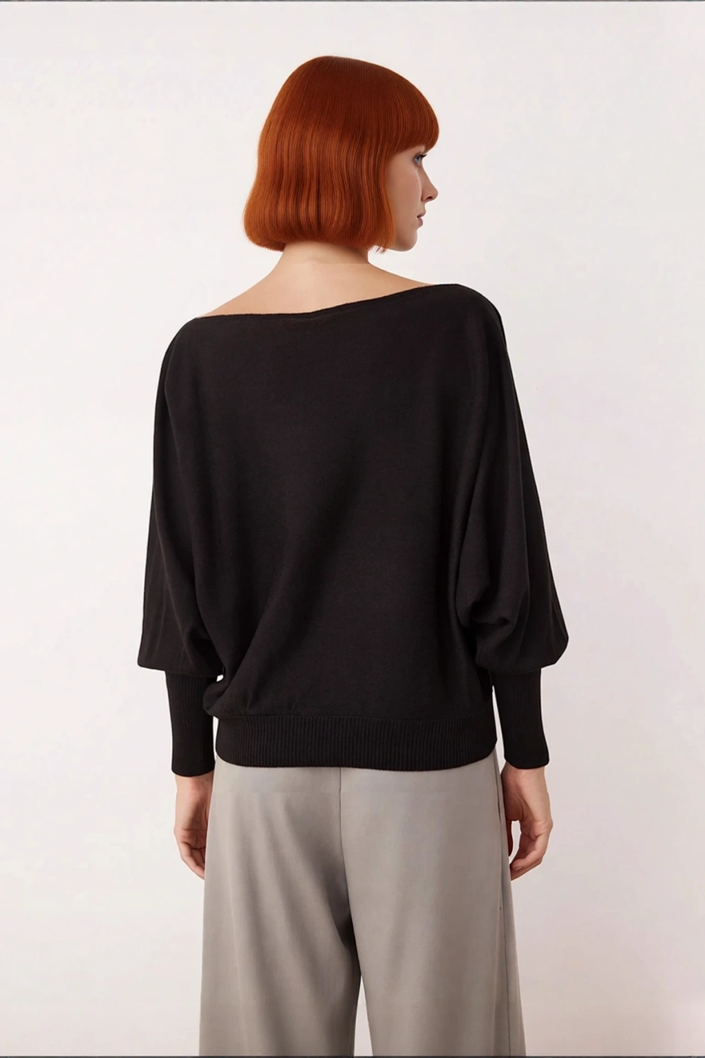 Ürün Özellikleri: Oversize kalıp, 100% Akrilik materyal, düz desen, kayık yaka, yarasa kol, triko kumaş, siyah renk, orta kalınlık.