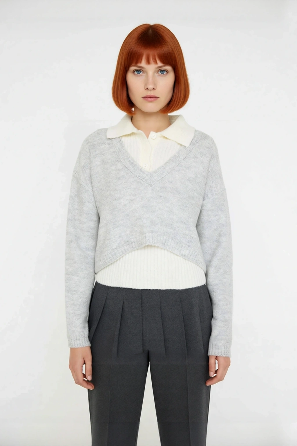 Ürün Özellikleri: Oversize kalıp, %80 Akrilik %20 Polyester materyal, düz desen, V yaka, standart uzun kol, triko kumaş, gri renk, crop boy.