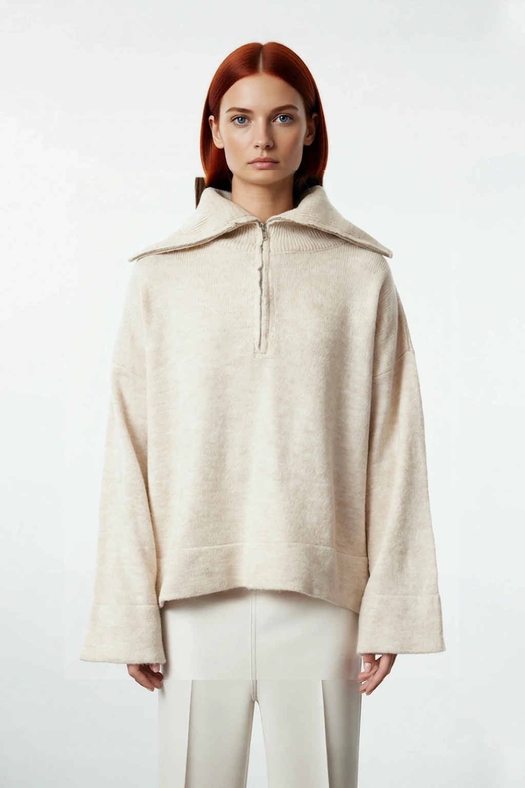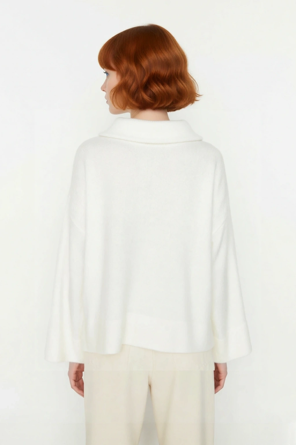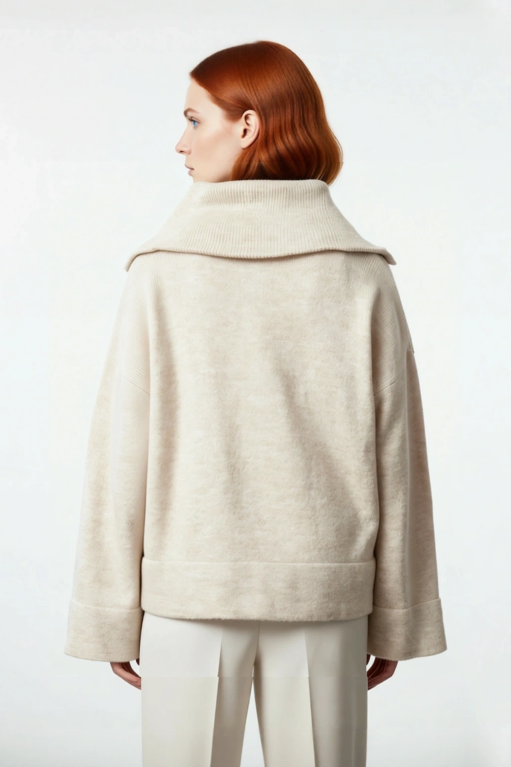 Ürün Özellikleri: Oversize kalıp, akrilik polyester materyal, düz desen, dik yaka, düşük kol, triko kumaş, ekru renk.