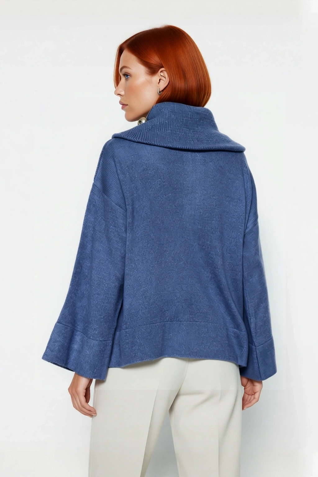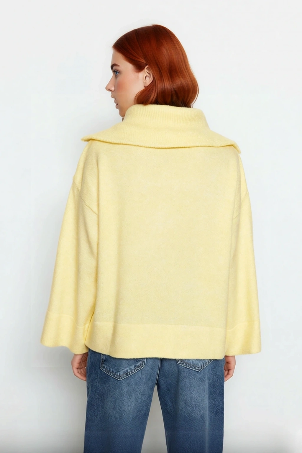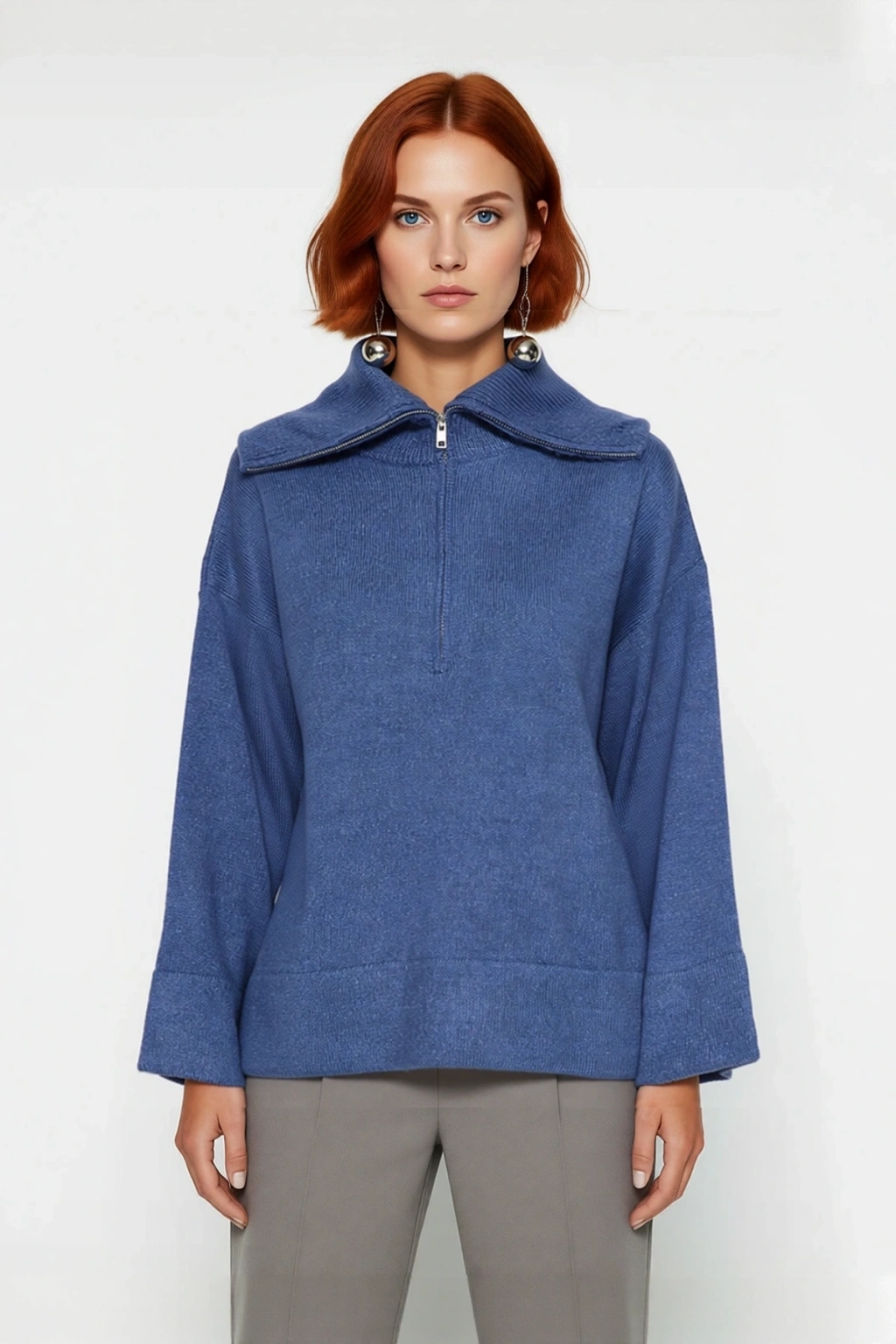 Yarım fermuarlı dik yaka detayı, kazağa modern bir dokunuş katarken, farklı hava koşullarına göre ayarlanabilir bir kullanım sunar. Düşük omuzlu ve uzun kollu yapısı, oversize kalıbı destekleyerek daha rahat ve salaş bir görünüm sağlar. Fitilli dokuma tekniğiyle üretilen triko kumaşı, orta kalınlığı sayesinde ne çok ince ne de çok kalın bir yapıya sahiptir, bu da onu kış ve geçiş mevsimleri için ideal kılar. Cepsiz ve kemersiz basic silueti, minimalist tarzı sevenler için mükemmeldir ve T41 yıkama talimatıyla kolayca temizlenebilir.