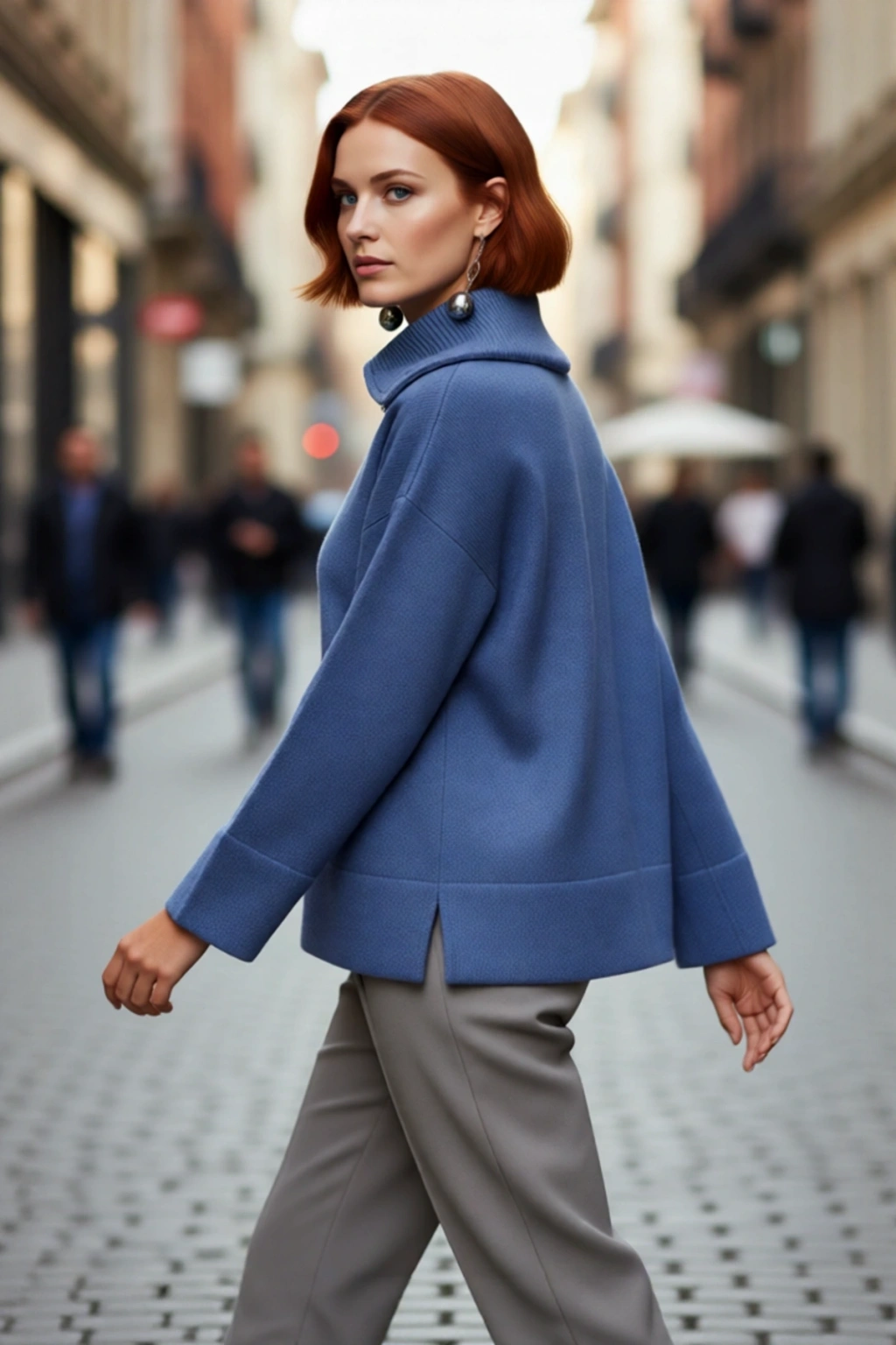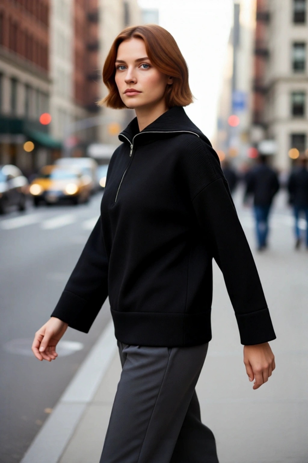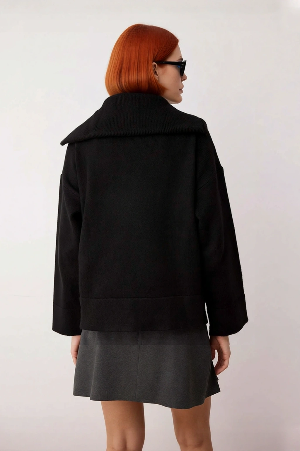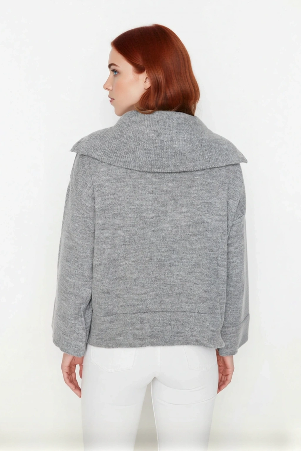 Yarım fermuarlı dik yaka detayı, kazağa modern bir dokunuş katarken, farklı hava koşullarına göre ayarlanabilir bir kullanım sunar. Düşük omuzlu ve uzun kollu yapısı, oversize kalıbı destekleyerek daha rahat ve salaş bir görünüm sağlar. Fitilli dokuma tekniğiyle üretilen triko kumaşı, orta kalınlığı sayesinde ne çok ince ne de çok kalın bir yapıya sahiptir, bu da onu kış ve geçiş mevsimleri için ideal kılar. Cepsiz ve kemersiz basic silueti, minimalist tarzı sevenler için mükemmeldir ve T41 yıkama talimatıyla kolayca temizlenebilir.