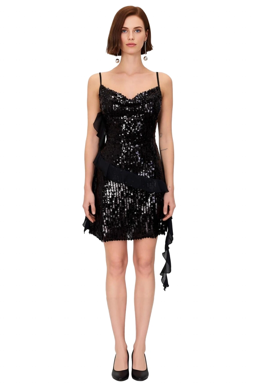 Ürün Özellikleri: A-line kalıp, %100 polyester materyal, düz desen, degaje yaka, ince askılı kol, payet dokuma kumaş, siyah renk, fırfırlı detay, astarlı, kısa/mini boy, skater siluet, kolsuz.