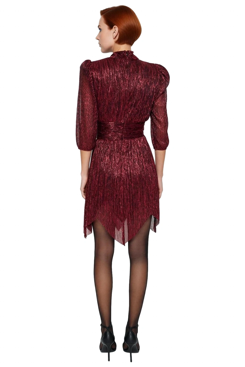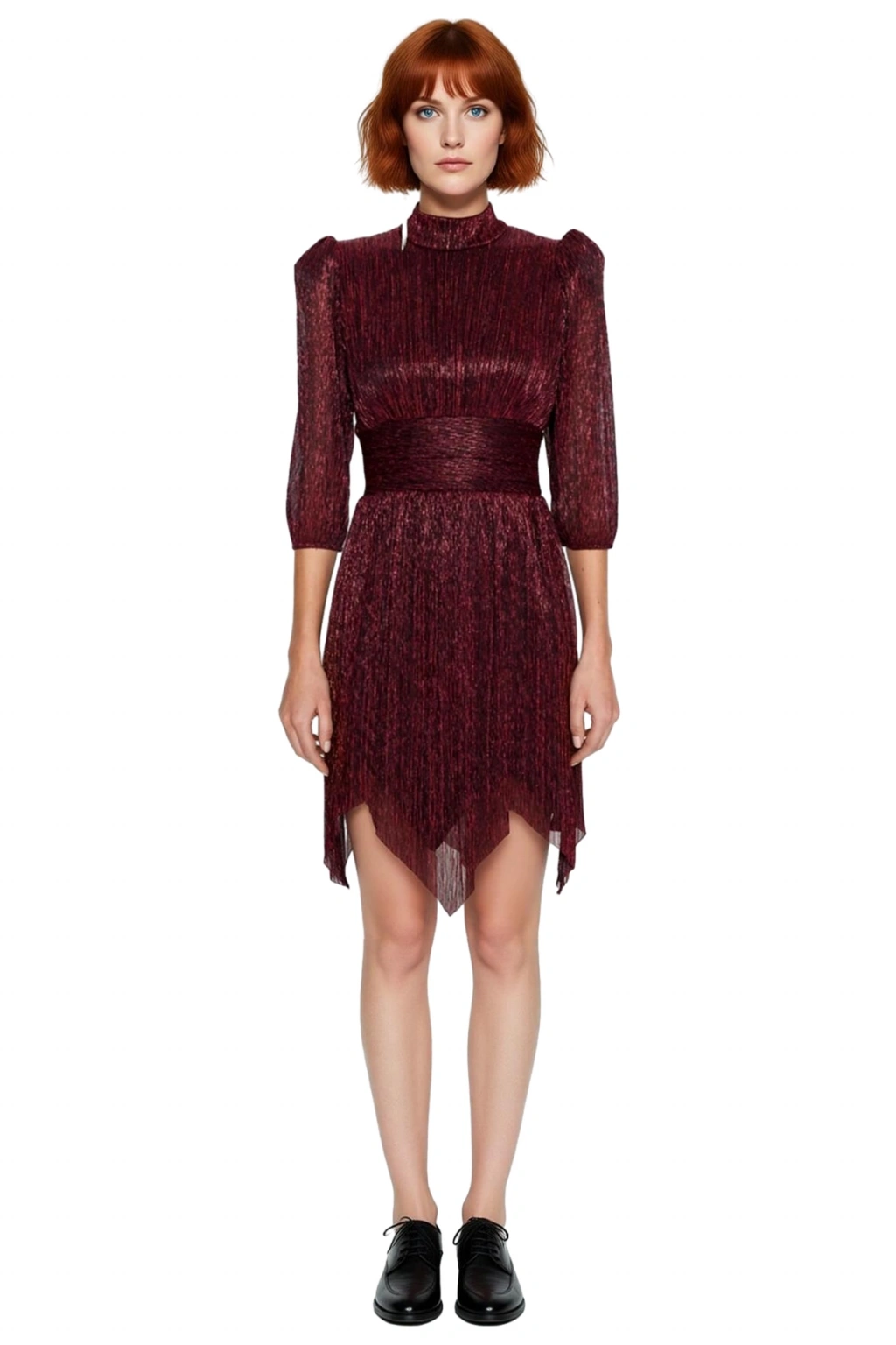 Ürün Özellikleri: A-line kalıp, polyester karışımlı materyal, düz desen, dik yaka, truvakar balon kol, örme kumaş, bordo renk, parıltılı detay, fermuarlı kapama, astarlı, kısa boy.