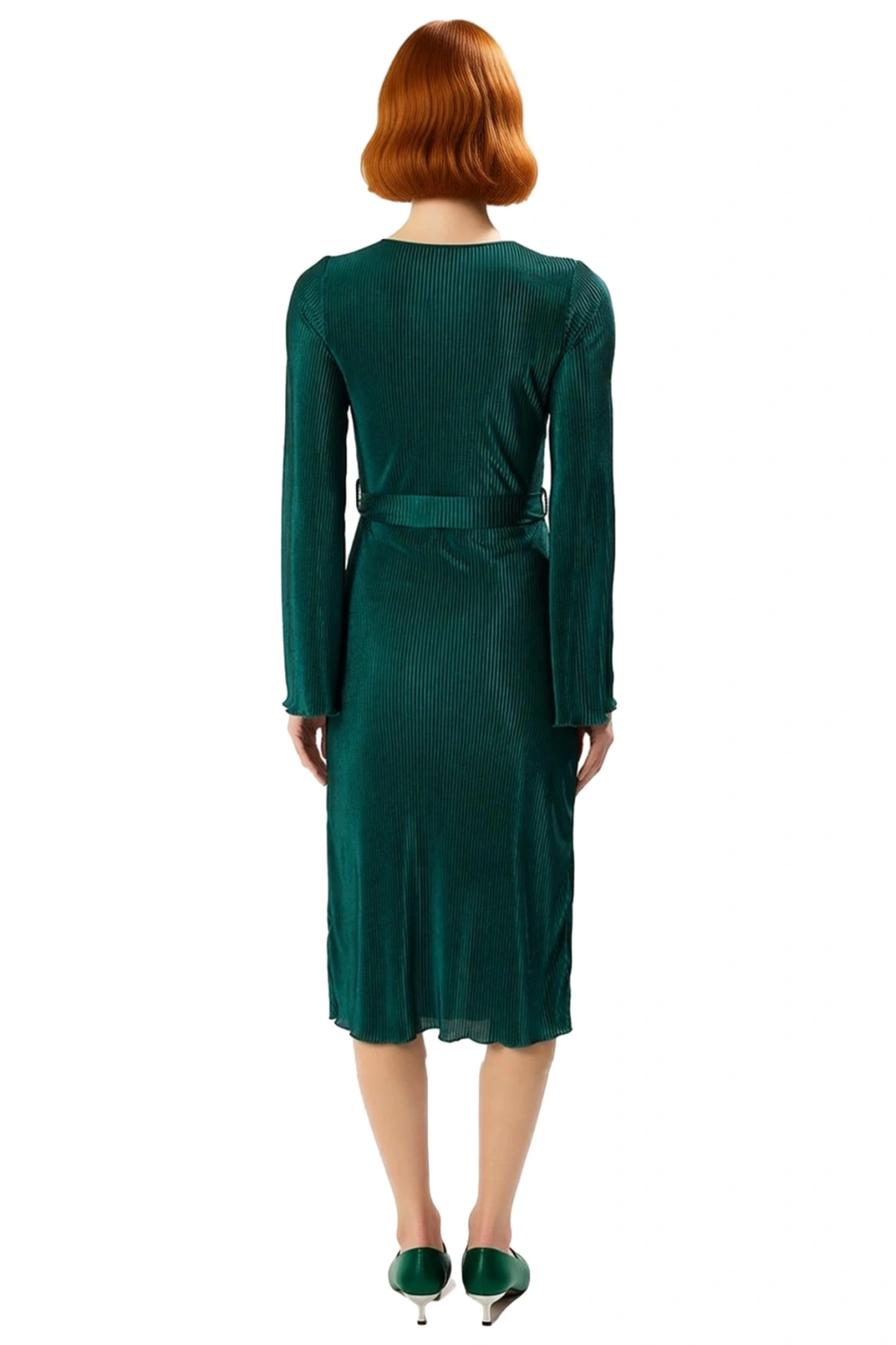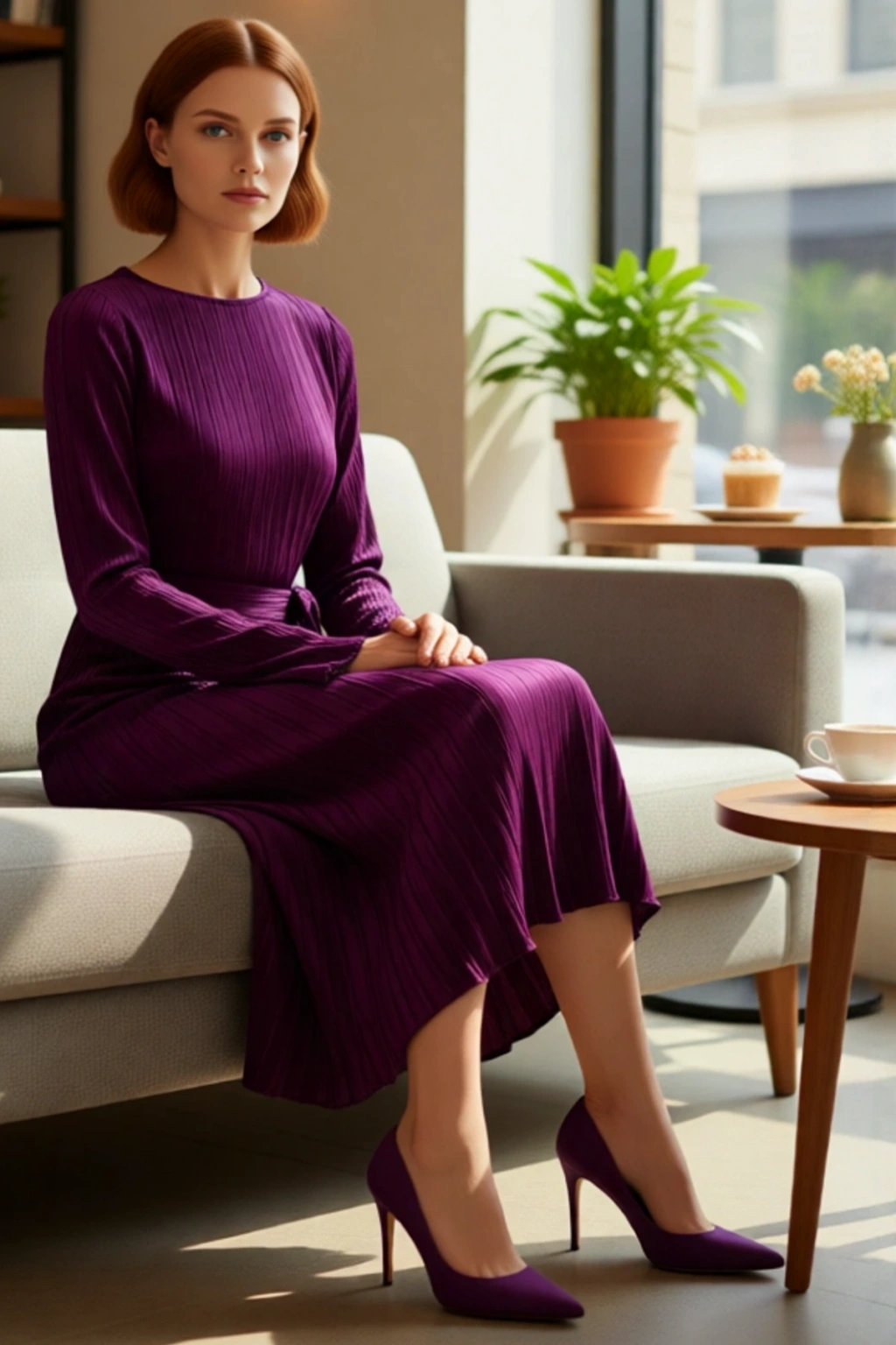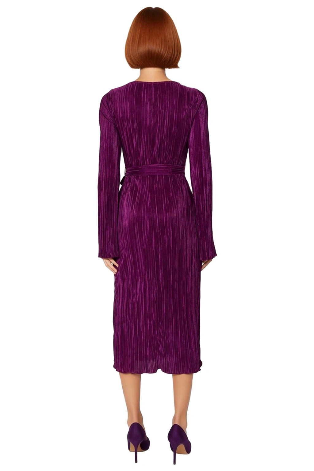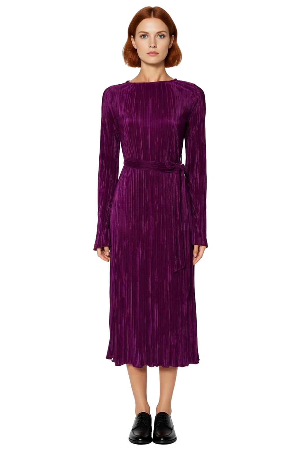 Ürün Özellikleri: Shift kalıp, polyester materyal, pilise desen, kayık yaka, standart kol, örme kumaş, mor renk.