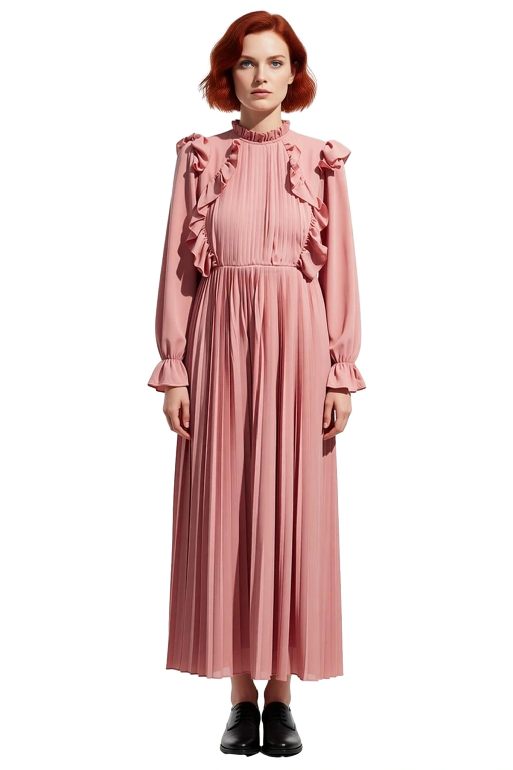 Bu zarif kadın elbisesi, skater kalıbı ile vücuda oturan üst kısmı ve hareketli piliseli eteğiyle dinamik bir siluet sunar. Yüksek kaliteli %100 polyester materyalden üretilmiş dokuma kumaşı sayesinde hem hafif hem de dökümlü bir yapıya sahiptir. Gül kurusu pembe rengi, sade ve düz deseniyle birleşerek sofistike bir şıklık yaratır. Özellikle şık ortamlar ve gece davetleri için tasarlanmış bu maxi boy elbise, Ramadan koleksiyonunun en gözde parçalarından biridir. Fashion Forward persona için ideal bu elbise, stil sahibi kadınların gardırobunda özel bir yer edinecek.