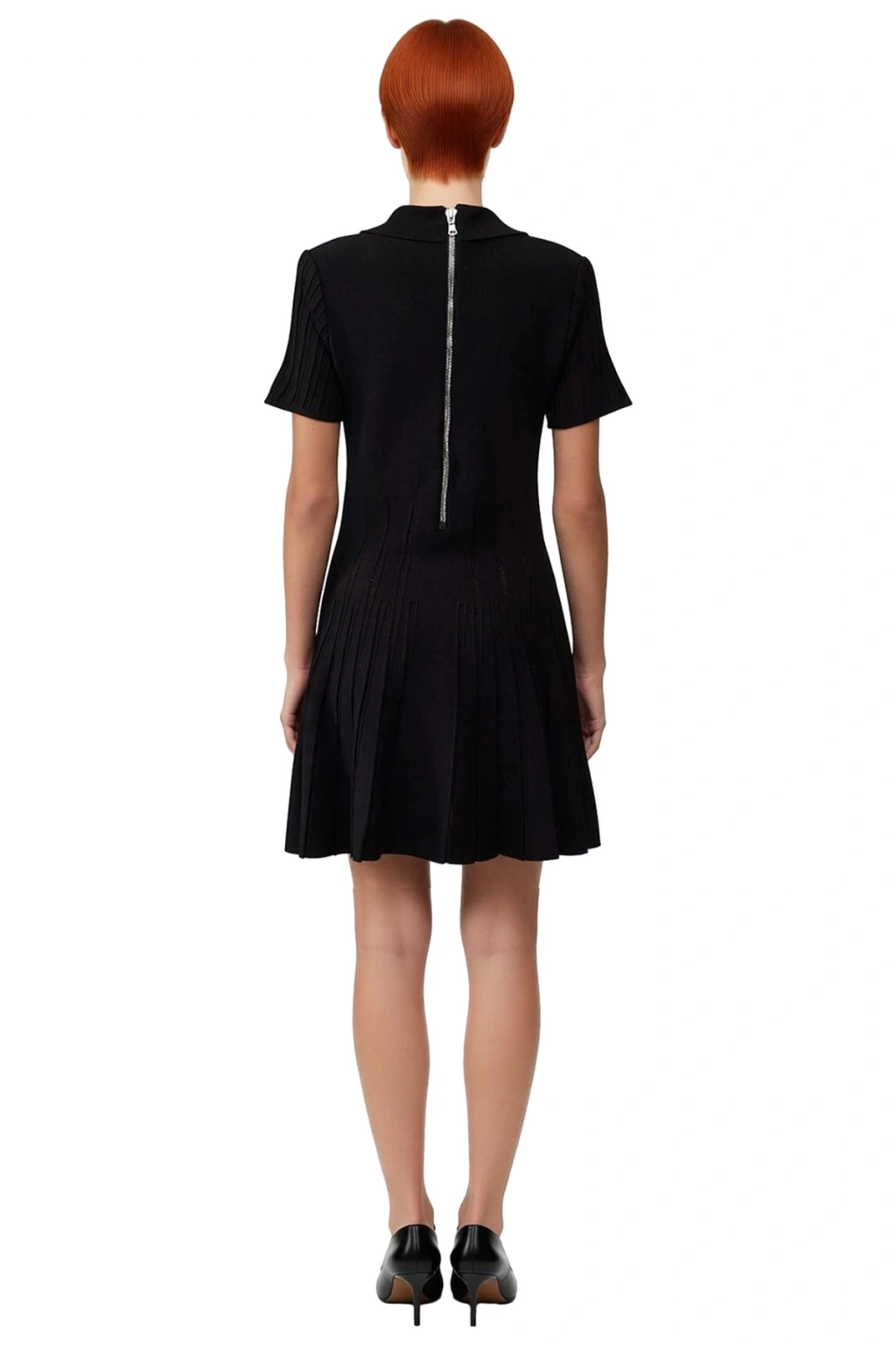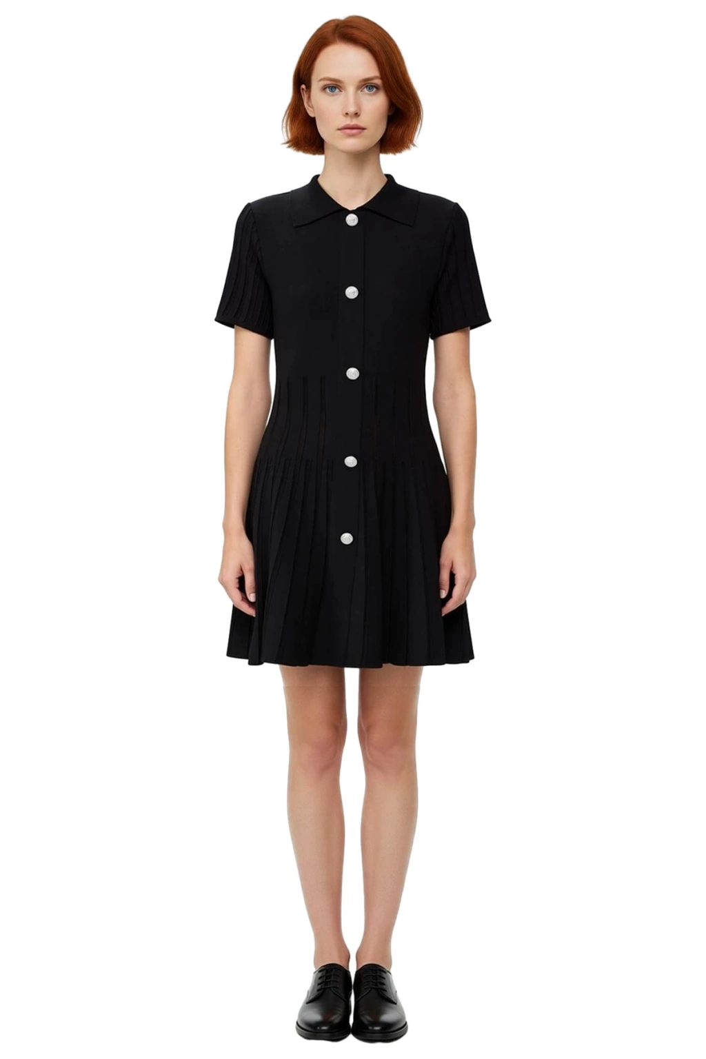 Ürün Özellikleri: A-line kalıp, viskoz polyester materyal, düz desen, polo yaka, kısa standart kol, triko fitilli kumaş, siyah renk.