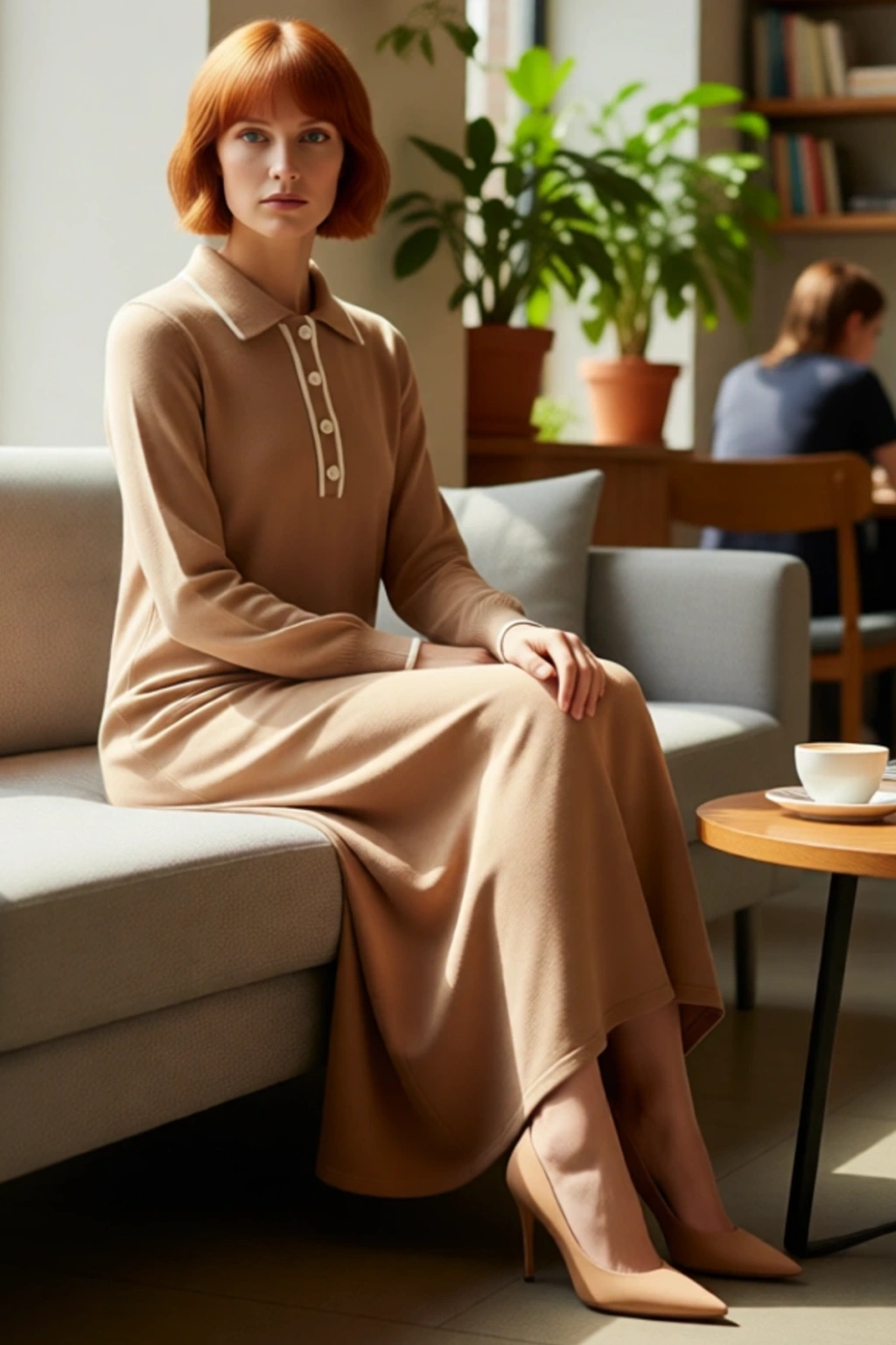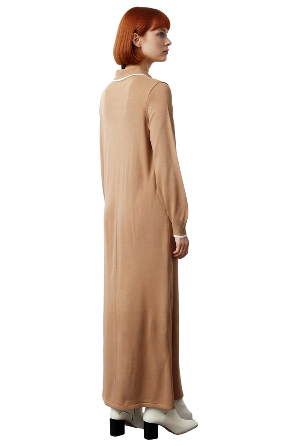 Ürün Özellikleri: A-line kalıp, %100 akrilik materyal, renk bloklu desen, polo yaka, düşük kol, uzun kol, triko kumaş, kahverengi renk, biyeli detay, cepsiz, astarsız, kemersiz, tek plaka dokuma, maxi boy, casual/günlük ortam, kış sezonu.