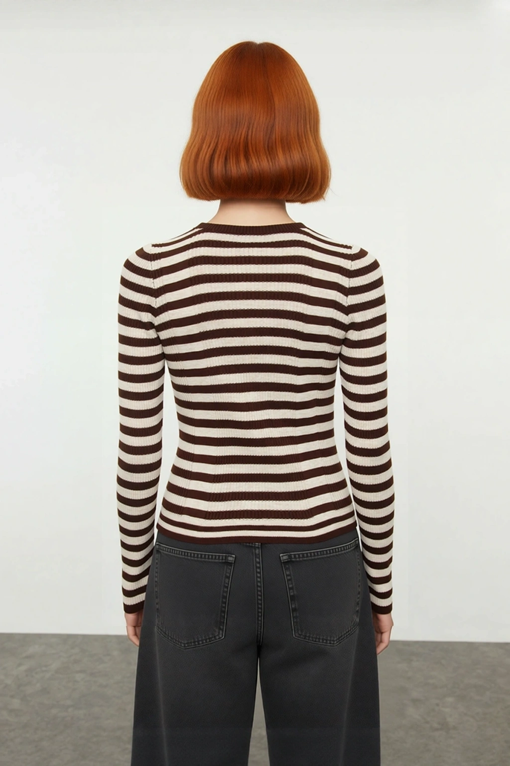 Ürün Özellikleri: Fitted kalıp, akrilik materyal, çizgili desen, polo yaka, standart kol, triko kumaş, kahverengi renk.