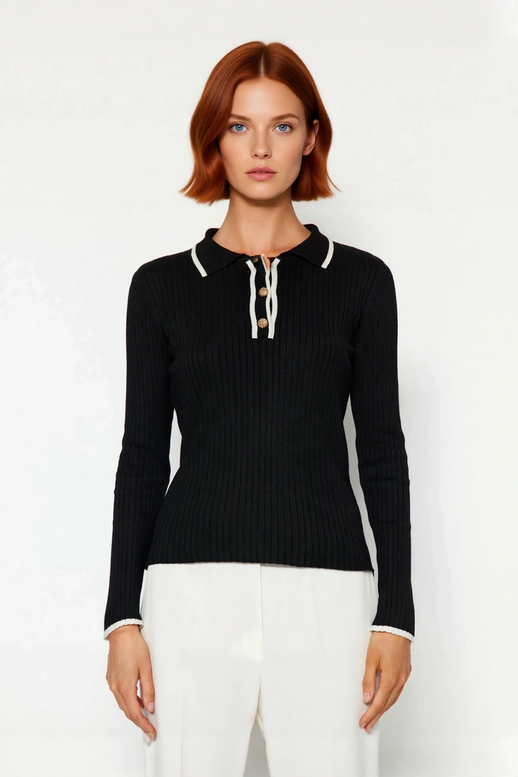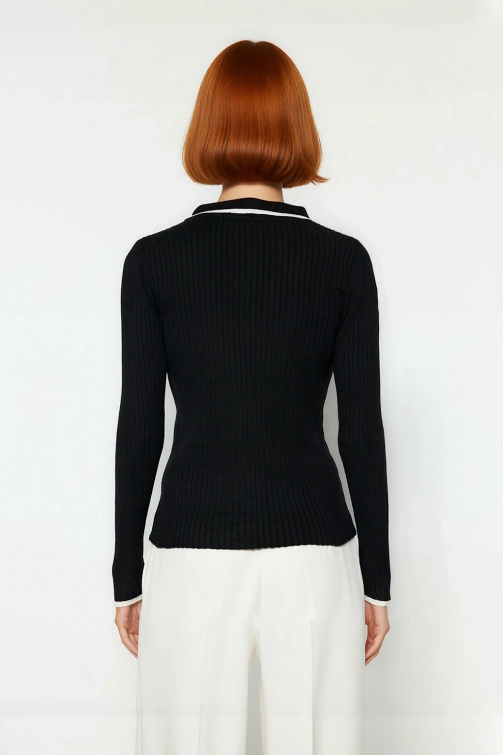 Bu kadın triko kazak, fitted kalıbı ile vücuda zarifçe oturarak modern ve şık bir siluet oluşturur. Yüksek kaliteli viskoz, polyester ve poliamid karışımı özel materyali sayesinde gün boyu süren konfor ve yumuşak bir dokunuş sunar. Canlı renk bloklu deseni, özellikle yaka ve manşetlerdeki kontrast beyaz detaylarla ürüne dinamik bir hava katarken, zamansız siyah rengi her türlü kombinasyona kolayca uyum sağlar. Merserize görünümlü ince iplik dokusu, şıklığı ve rahatlığı bir araya getirerek günlük tarzınıza sofistike ve elegant bir dokunuş ekler, sizi her ortamda ön plana çıkarır.