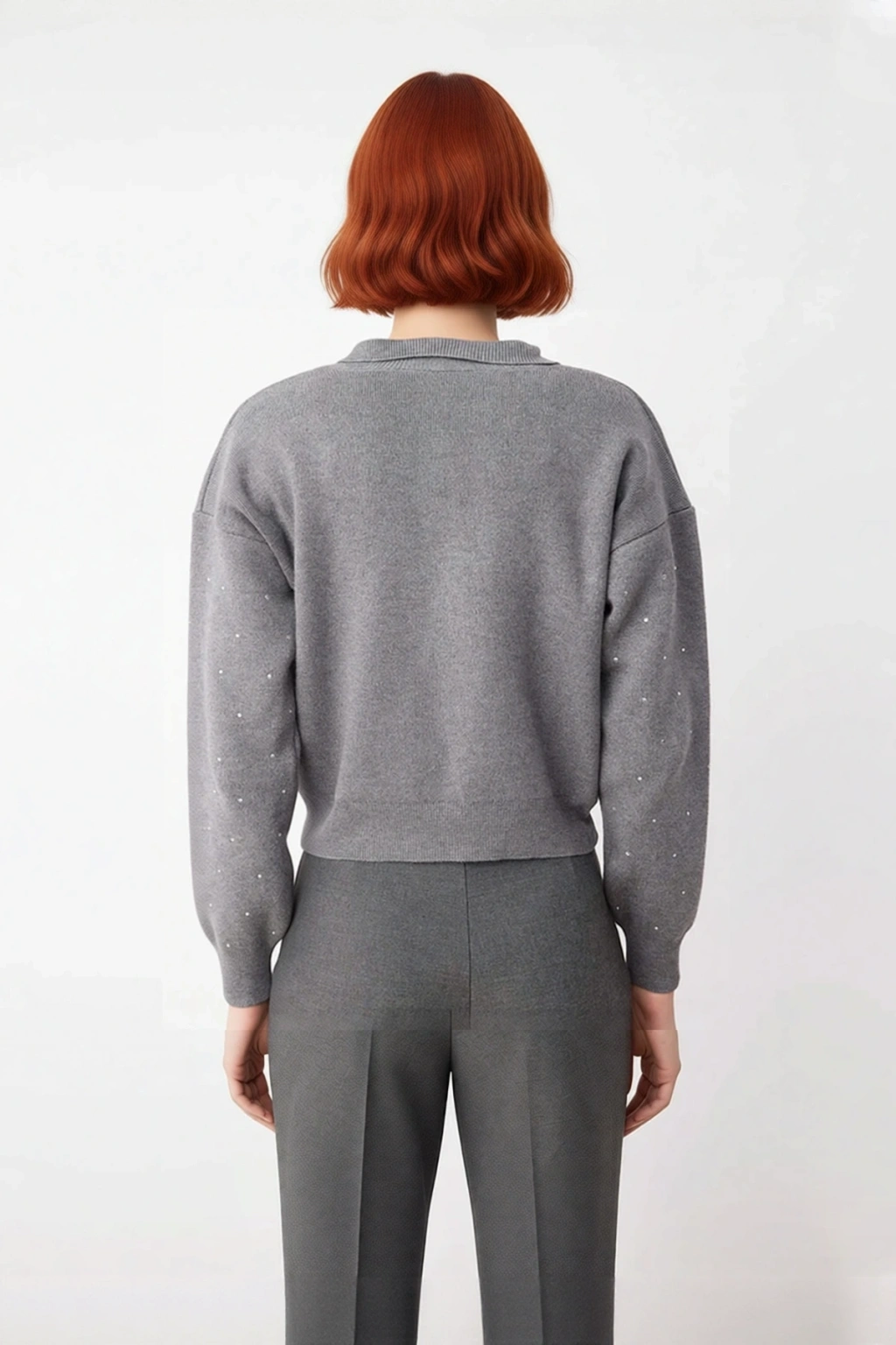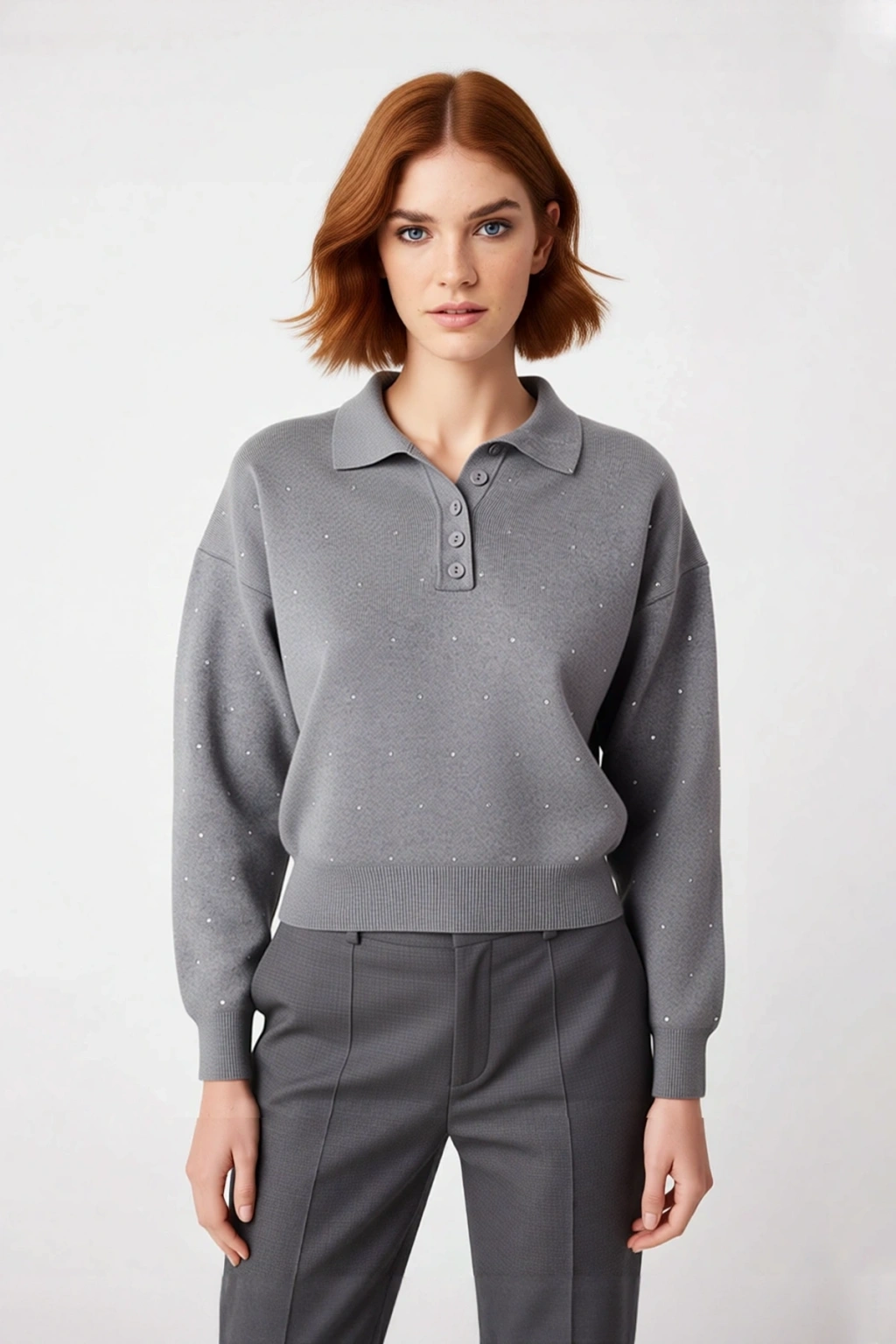 Ürün Özellikleri: Regular kalıp, viskoz polyester poliamid materyal, taş detaylı desen, polo yaka, düşük kol, triko kumaş, gri renk, basic siluet.