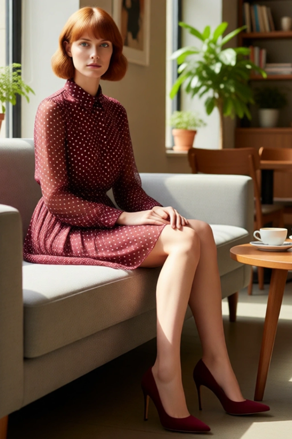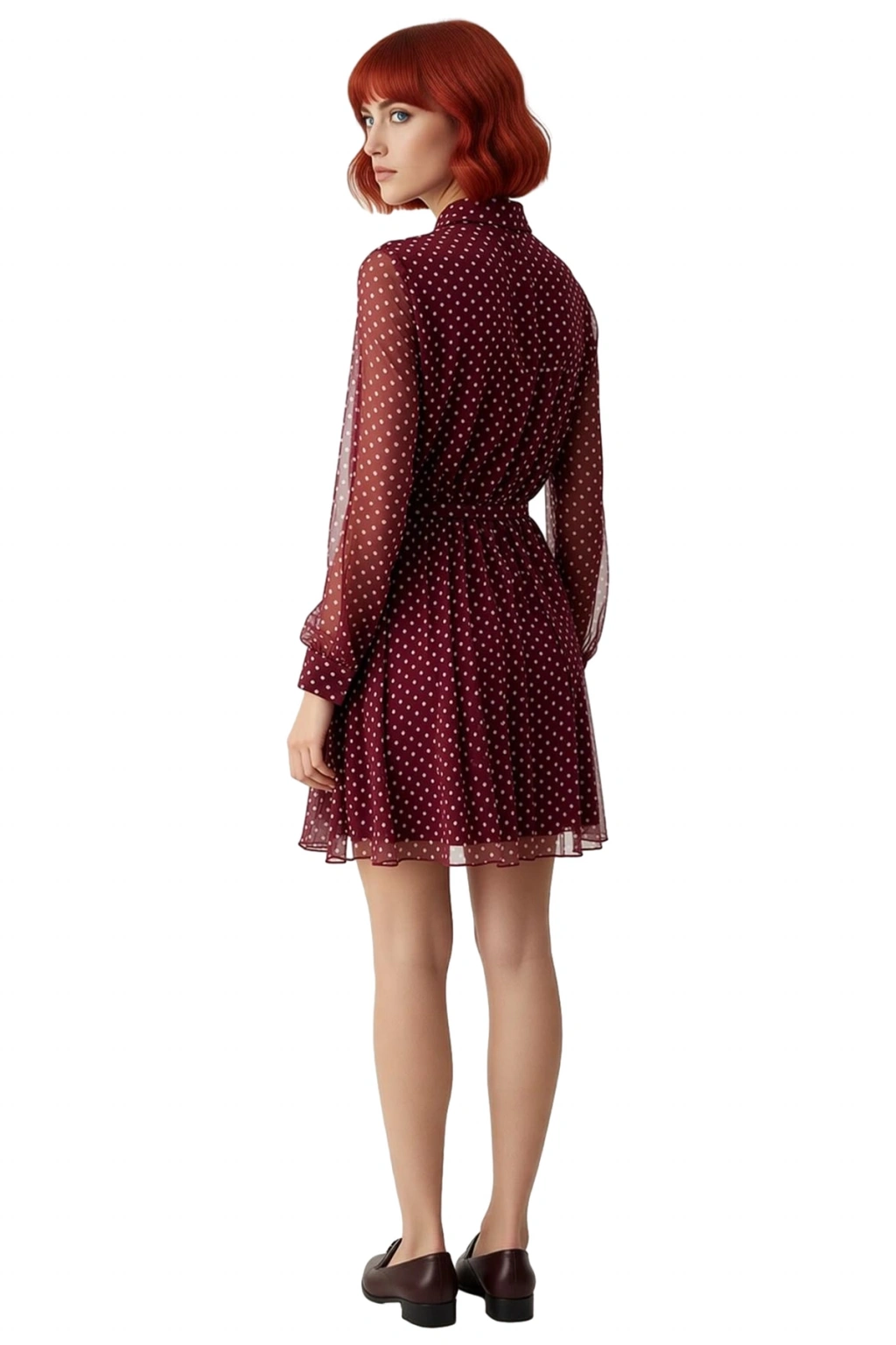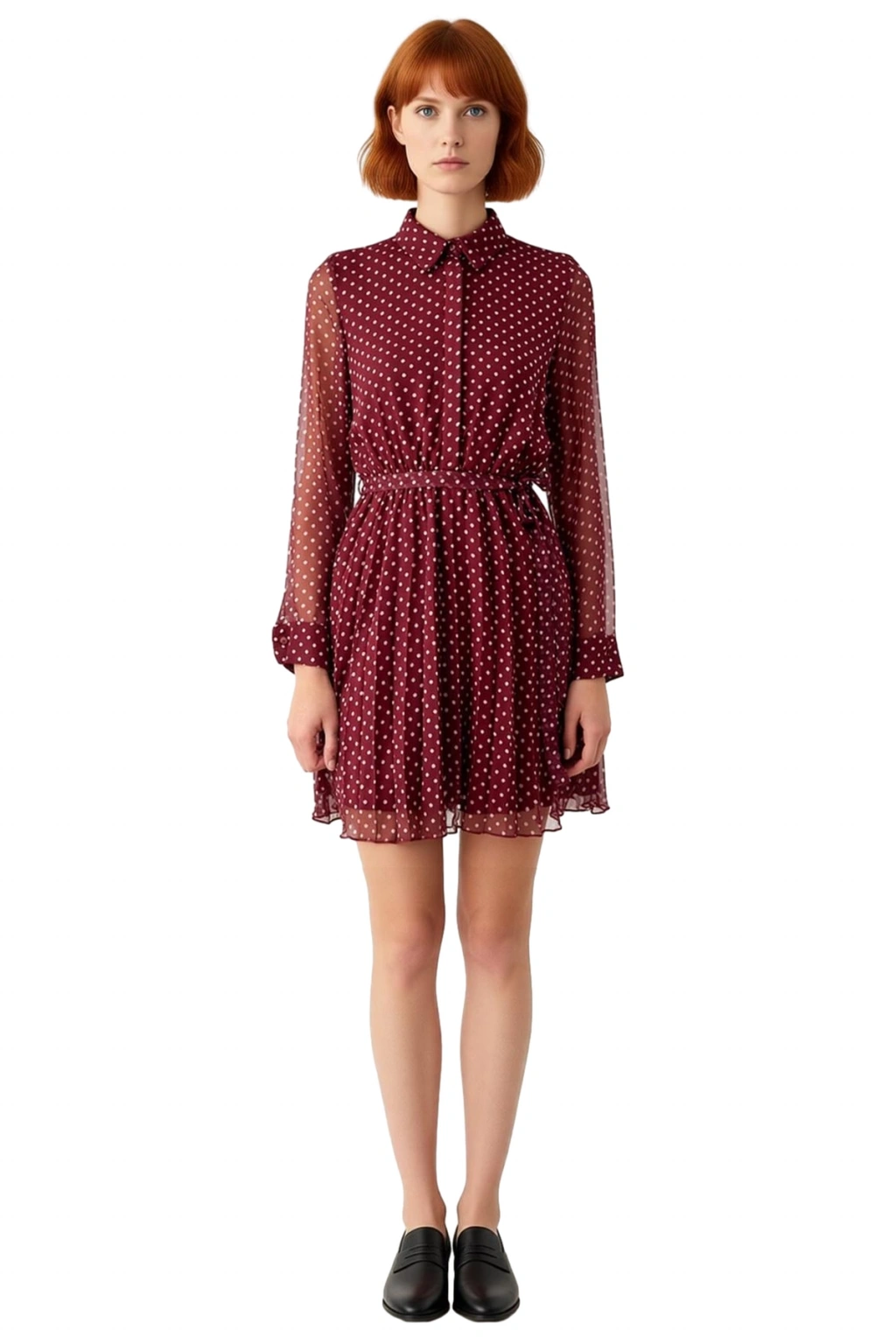 Ürün Özellikleri: Skater kalıp, polyester materyal, puantiyeli desen, gömlek yaka, standart kol, şifon dokuma kumaş, bordo renk, kuşaklı tasarım, astarlı durum.