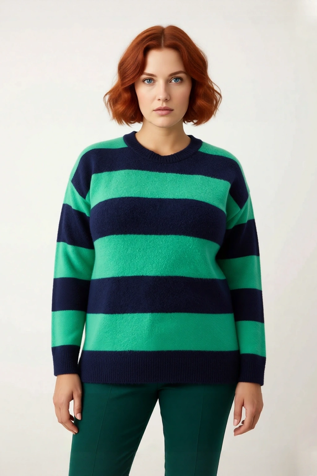 Ürün Özellikleri: Regular kalıp, %80 akrilik %20 polyester materyal, çizgili desen, bisiklet yaka, düşük kol uzun kol, triko kumaş, kırmızı pembe renk.