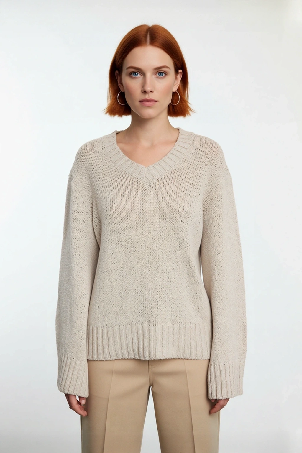 Ürün Özellikleri: Oversize kalıp, 50% Pamuk 50% Polyester materyal, düz desen, V yaka, standart kol, triko kumaş, bej renk.
