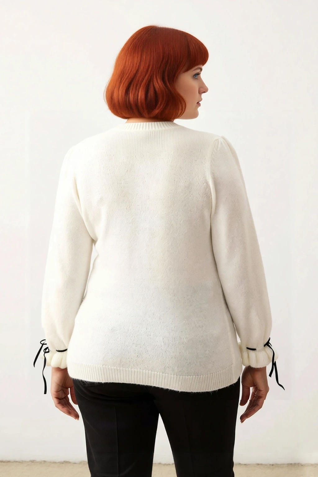 Ürün Özellikleri: Regular kalıp, akrilik materyal, ajurlu desen, dik yaka, düşük kol, triko kumaş, ekru renk, baskısız tasarım.