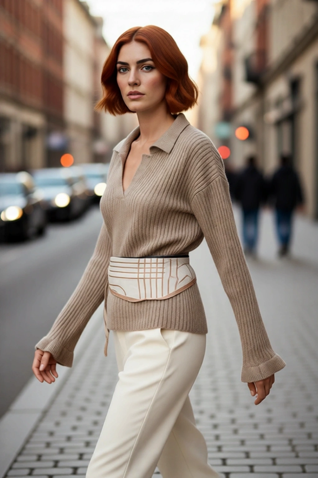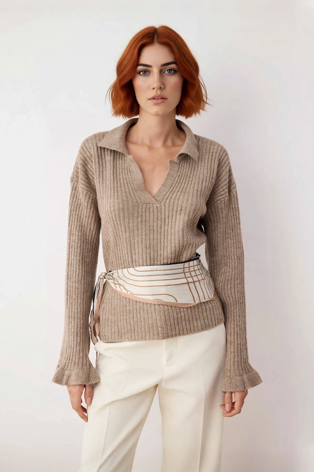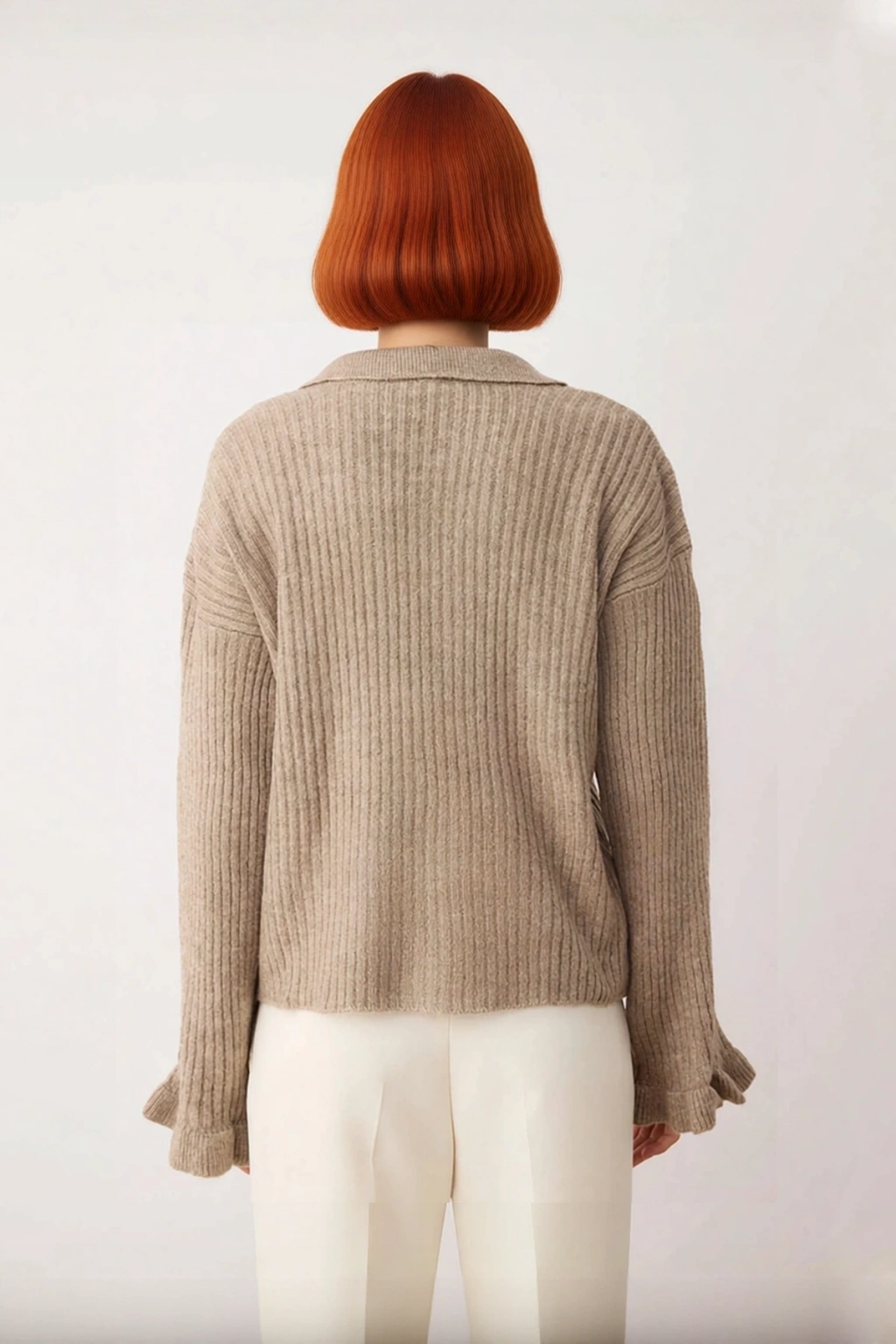 Apaş yaka, modern ve havalı bir görünüm sağlarken, kolay giyilip çıkarılabilme özelliğiyle pratik bir kullanım sunar. Uzun standart kol tasarımı, volanlı manşet detaylarıyla klasik çizginin dışına çıkarak feminen bir dokunuş ekler. Orta kalınlıktaki tek plaka dokuma triko kumaş, mevsim geçişlerinde ve soğuk kış günlerinde ideal bir koruma sağlarken, esnek yapısıyla hareket özgürlüğünü destekler. Makinede yıkanabilir özelliği ile bakım kolaylığı sunan bu kazak, kalitesiyle uzun süre gardırobunuzda yerini koruyacak.