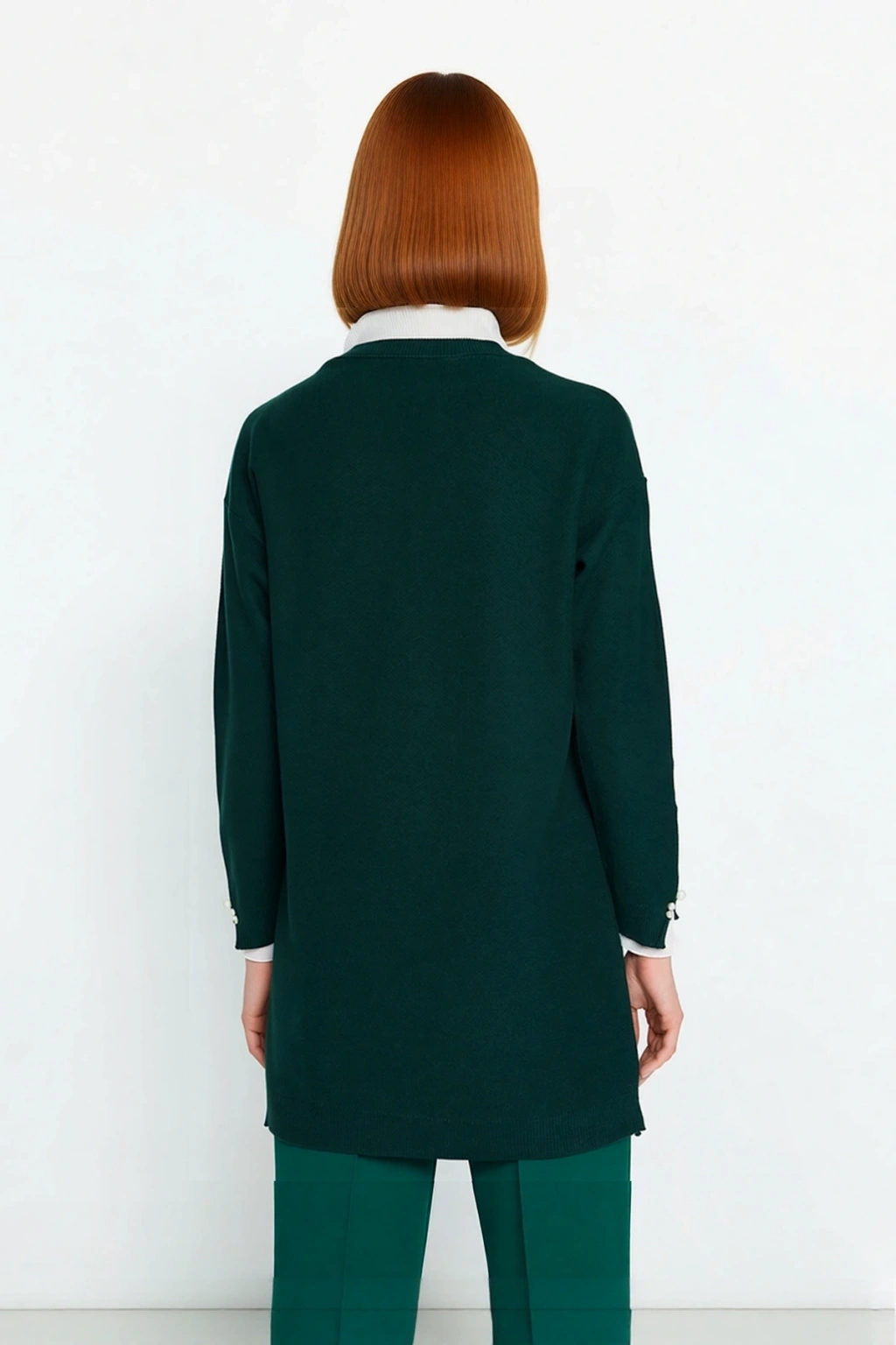 Ürün Özellikleri: Regular kalıp, %100 akrilik materyal, düz desen, bisiklet yaka, düşük kol, triko kumaş, koyu yeşil renk, dantel ve inci detaylı tasarım.