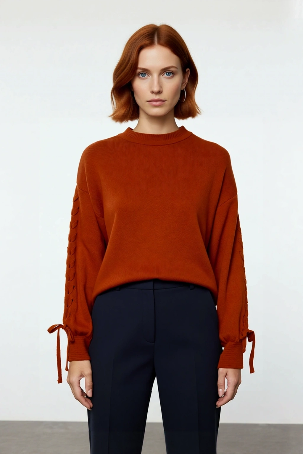 Ürün Özellikleri: Regular kalıp, 100% akrilik materyal, düz desen, bisiklet yaka, düşük kol, triko kumaş, kahverengi renk, dokuma detaylı.