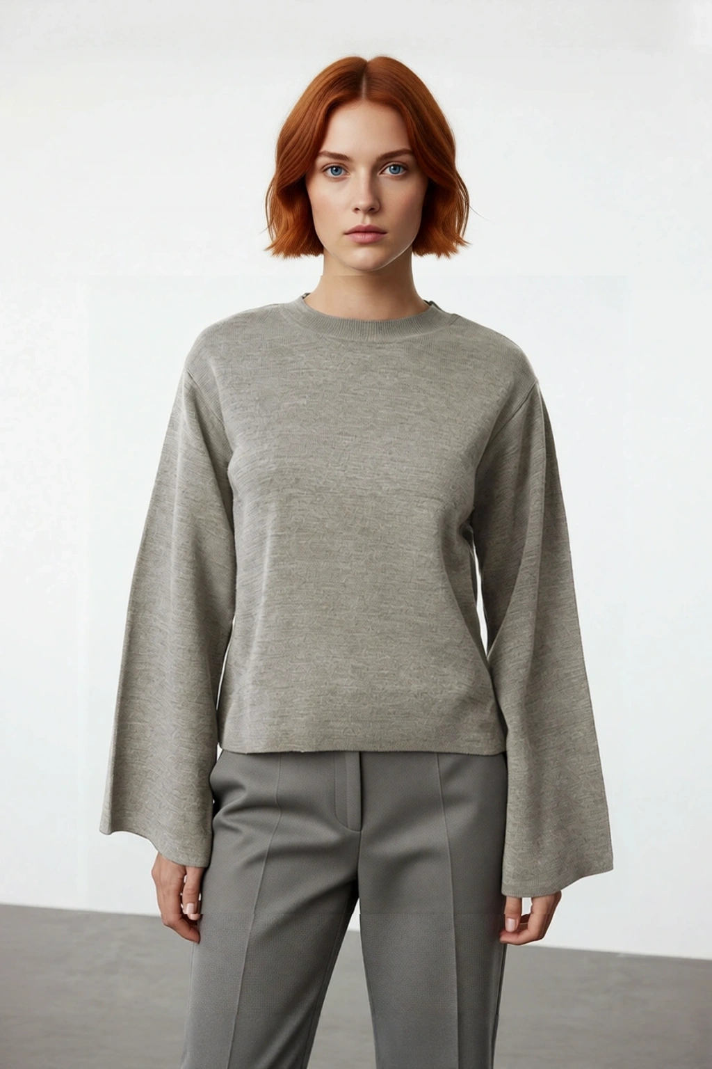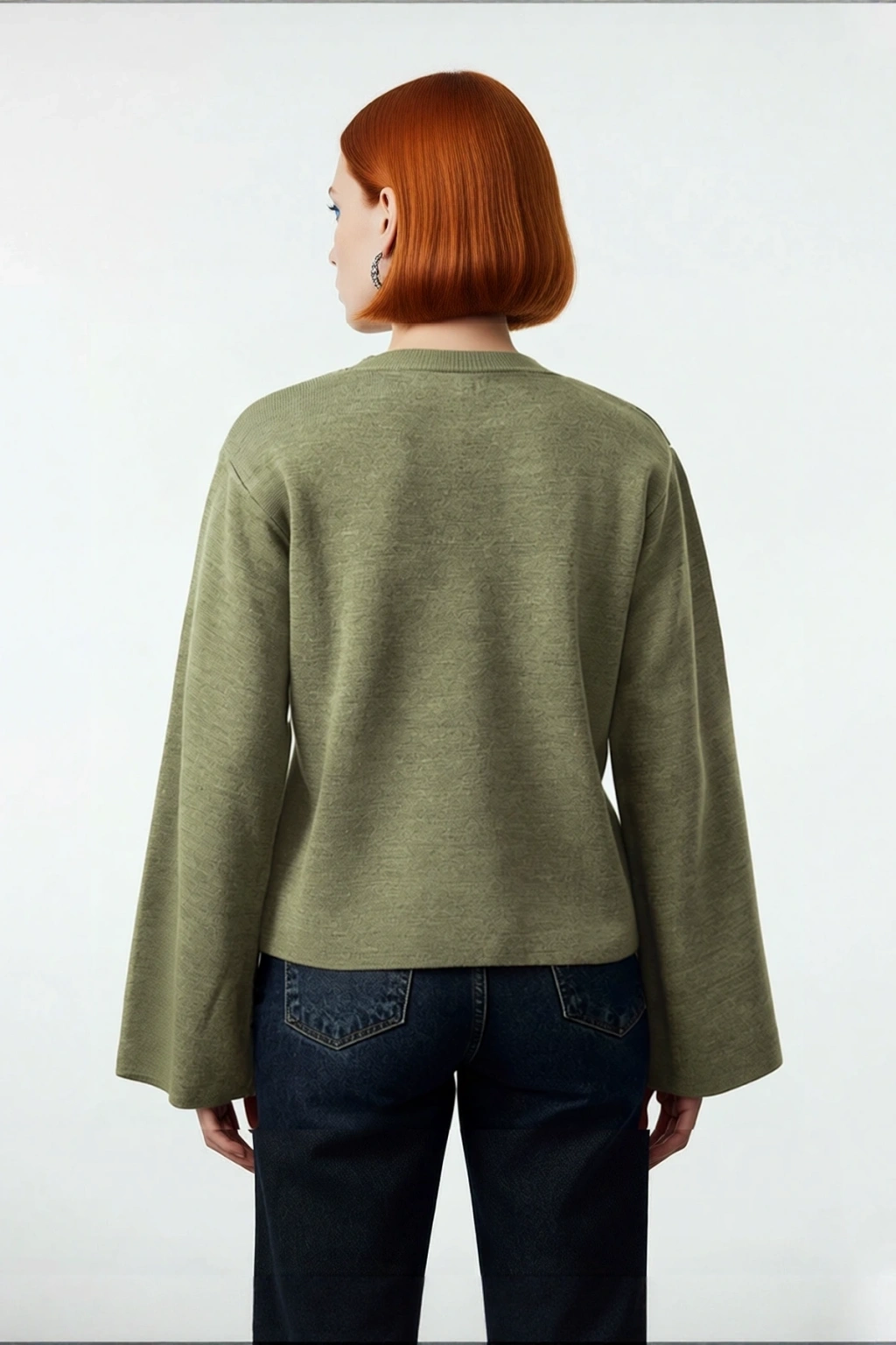 Ürün Özellikleri: Regular kalıp, akrilik materyal, düz desen, bisiklet yaka, İspanyol kol, triko kumaş, haki renk, baskısız tasarım.