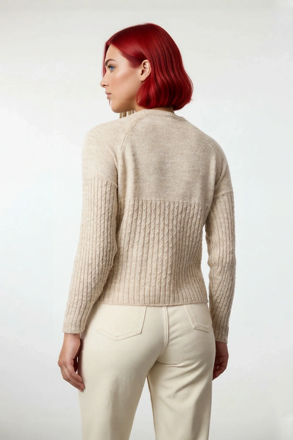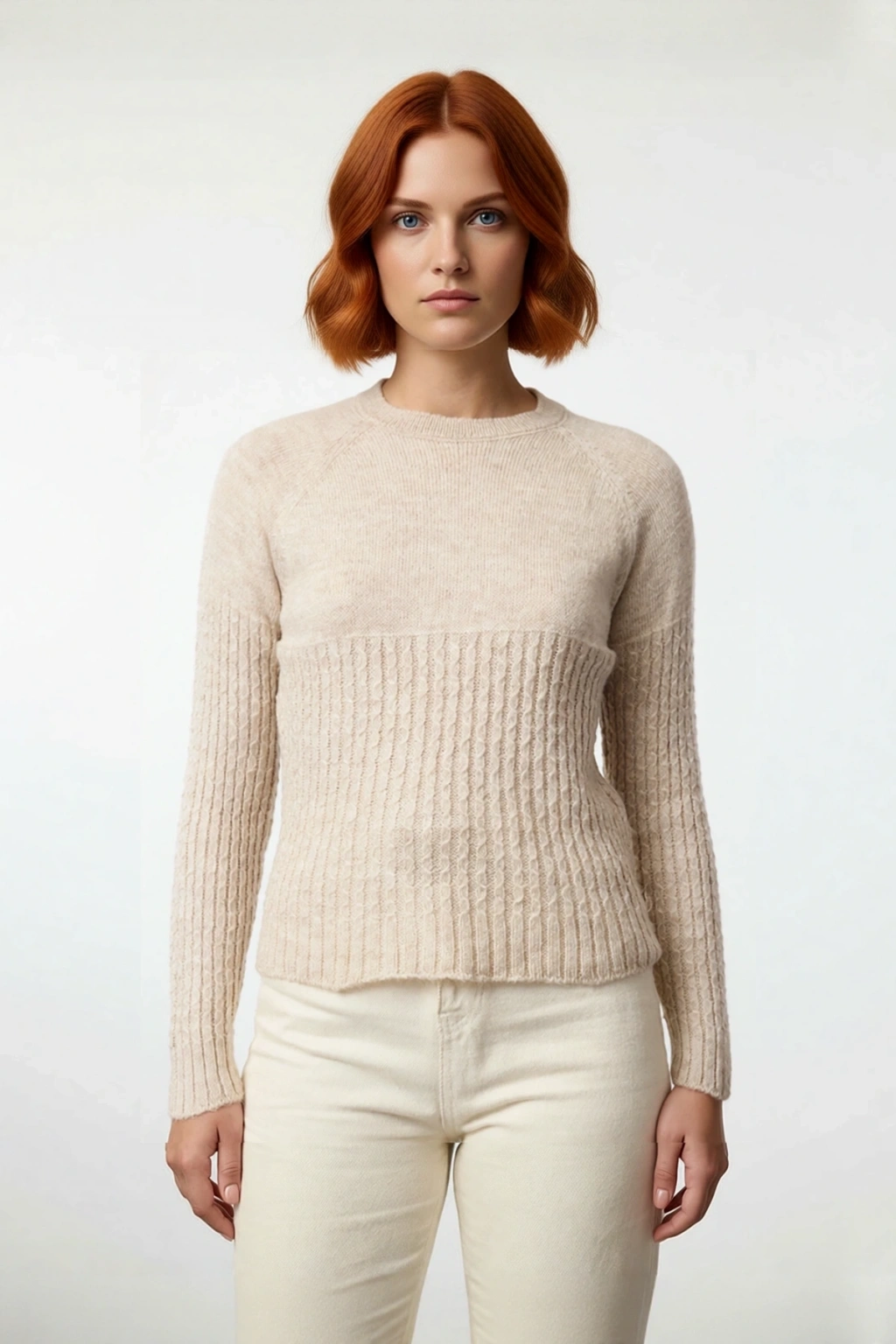 Ürün Özellikleri: Regular kalıp, %73 akrilik %27 polyester materyal, düz desen, bisiklet yaka, standart kol, triko kumaş, bej renk.