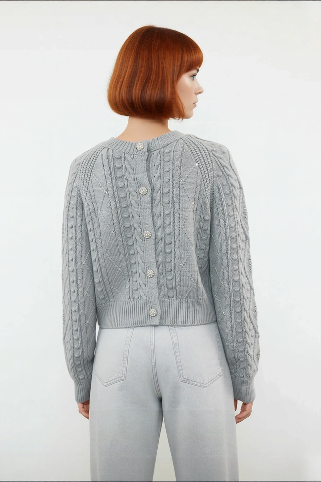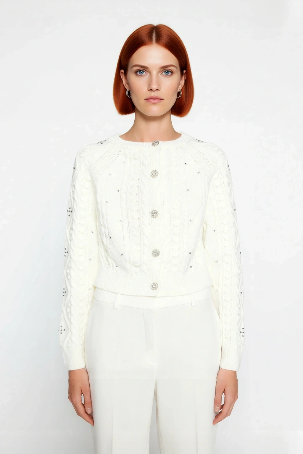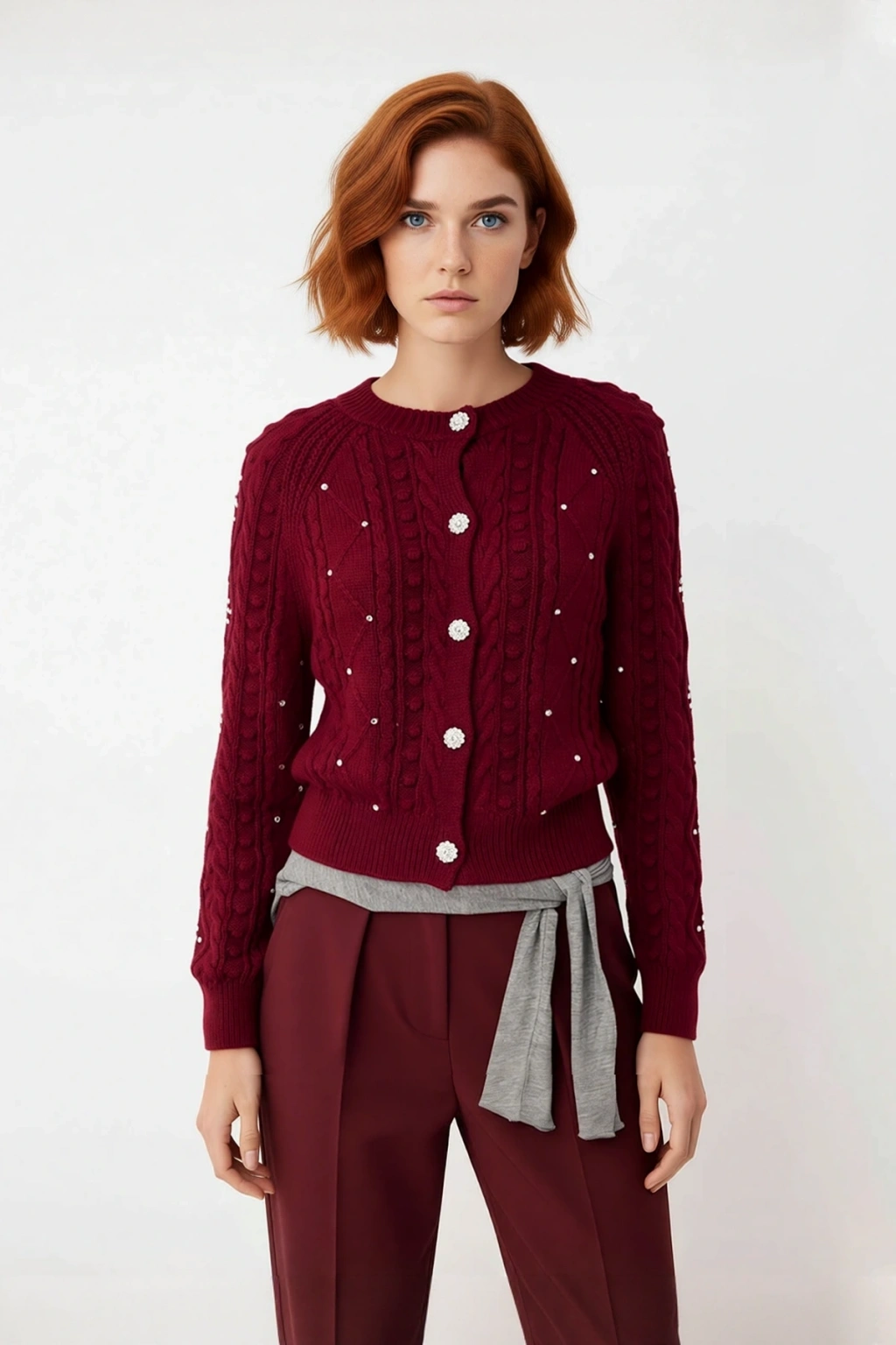 Kadınlar için özel olarak tasarlanmış bu akrilik triko hırka, regular kalıbıyla gün boyu süren konfor ve şıklığı bir arada sunar. Yumuşacık akrilik materyali, teninize hoş bir dokunuş sağlarken, kış aylarının soğuğuna karşı etkili bir koruma kalkanı oluşturur. Bordo rengi ve zarif saç örgü deseni, ürüne sofistike bir hava katarken, üzerinde yer alan pırıltılı taş detayları ve dekoratif düğmelerle feminen bir çekicilik kazanır. Crop boyu ve basic siluetiyle modern kadınların gardırobuna uyum sağlar.