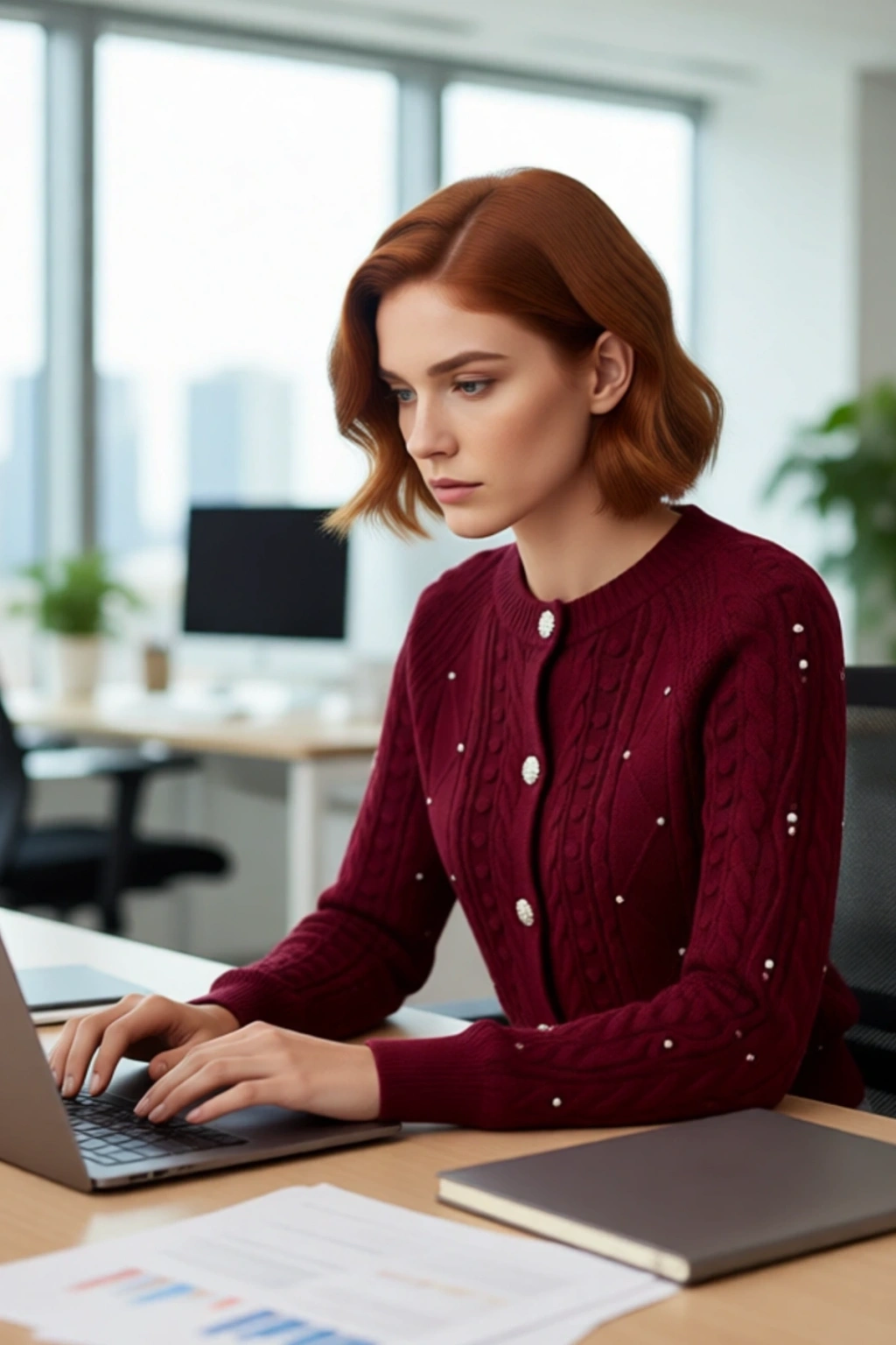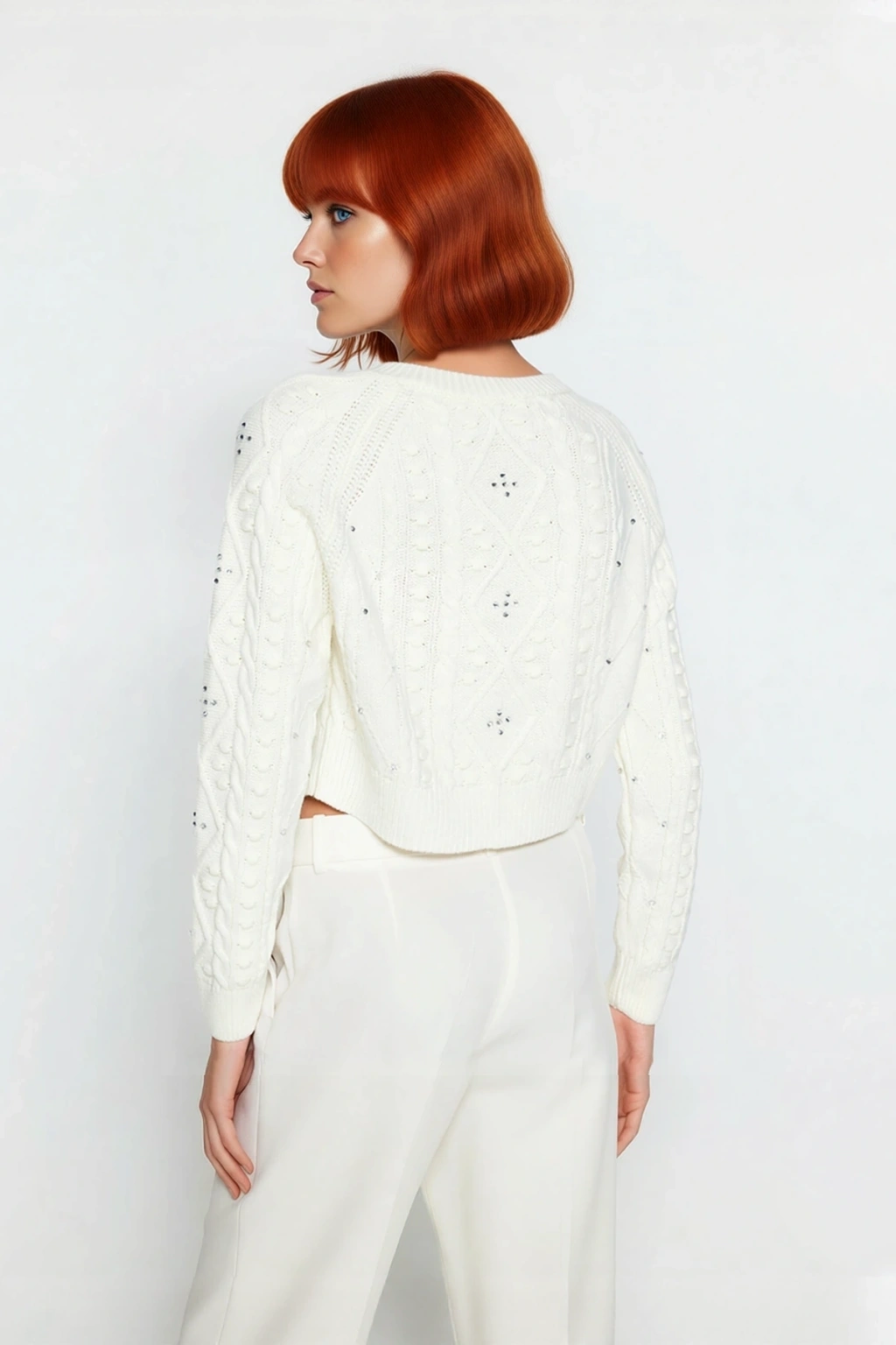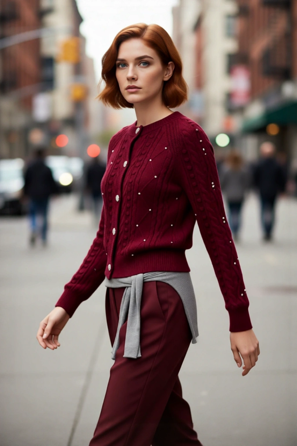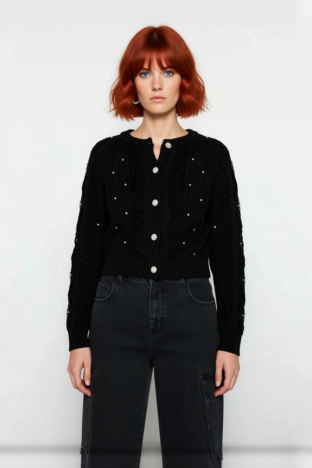 Kadınlar için özel olarak tasarlanmış bu akrilik triko hırka, regular kalıbıyla gün boyu süren konfor ve şıklığı bir arada sunar. Yumuşacık akrilik materyali, teninize hoş bir dokunuş sağlarken, kış aylarının soğuğuna karşı etkili bir koruma kalkanı oluşturur. Bordo rengi ve zarif saç örgü deseni, ürüne sofistike bir hava katarken, üzerinde yer alan pırıltılı taş detayları ve dekoratif düğmelerle feminen bir çekicilik kazanır. Crop boyu ve basic siluetiyle modern kadınların gardırobuna uyum sağlar.