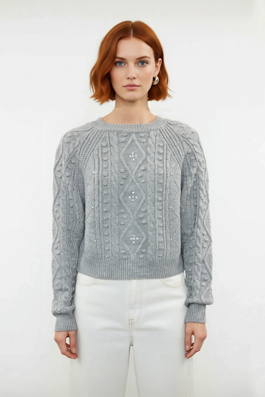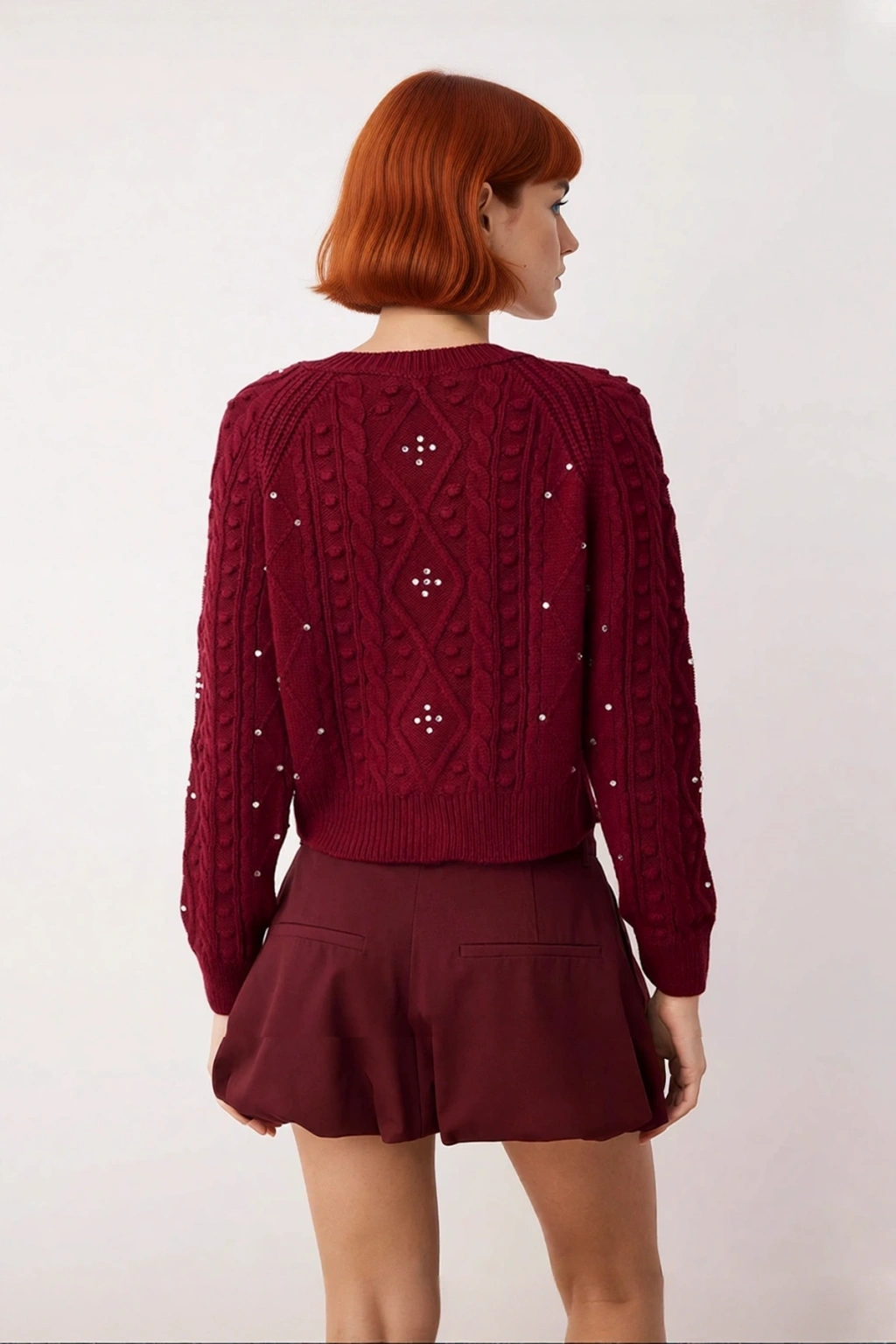 Ürün Özellikleri: Regular kalıp, akrilik materyal, saç örgü desen, bisiklet yaka, reglan kol, triko kumaş, bordo renk.