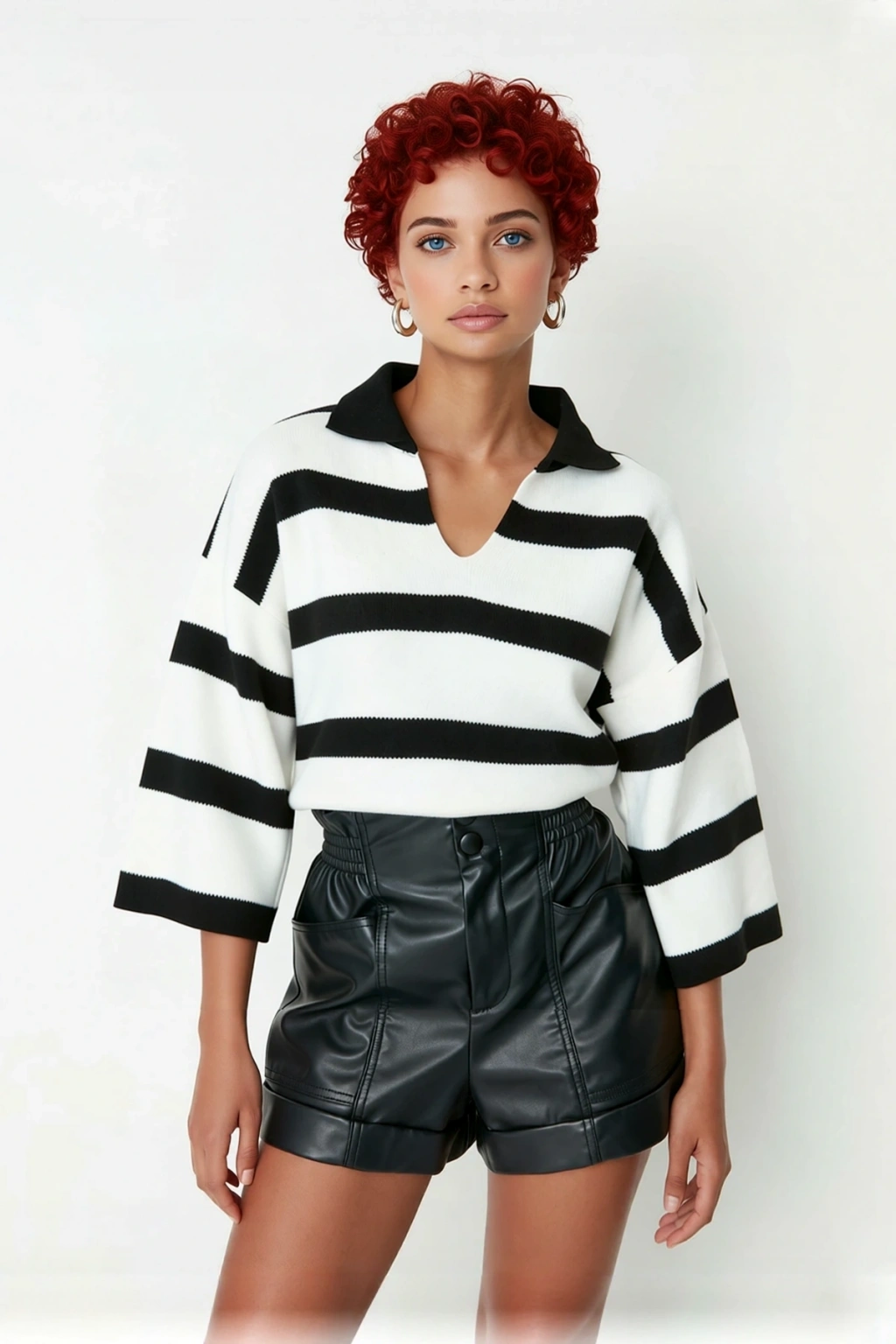 Ürün Özellikleri: Regular kalıp, akrilik materyal, çizgili desen, polo yaka, truvakar kol, triko kumaş, bordo renk, basic siluet.