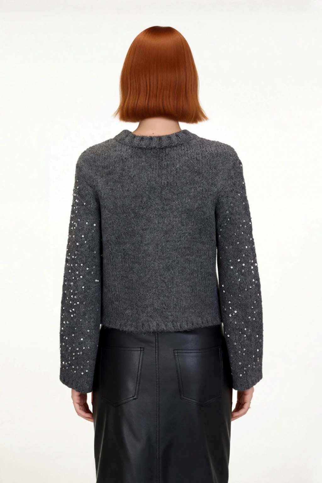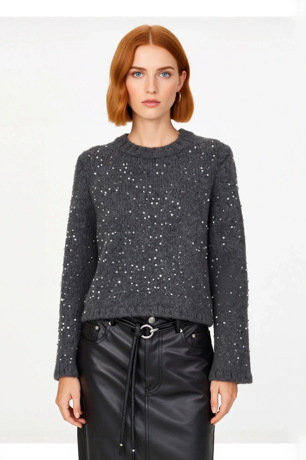 Ürün Özellikleri: Regular kalıp, akrilik polyester materyal, pul payetli desen, bisiklet yaka, standart kol, triko kumaş, gri renk.