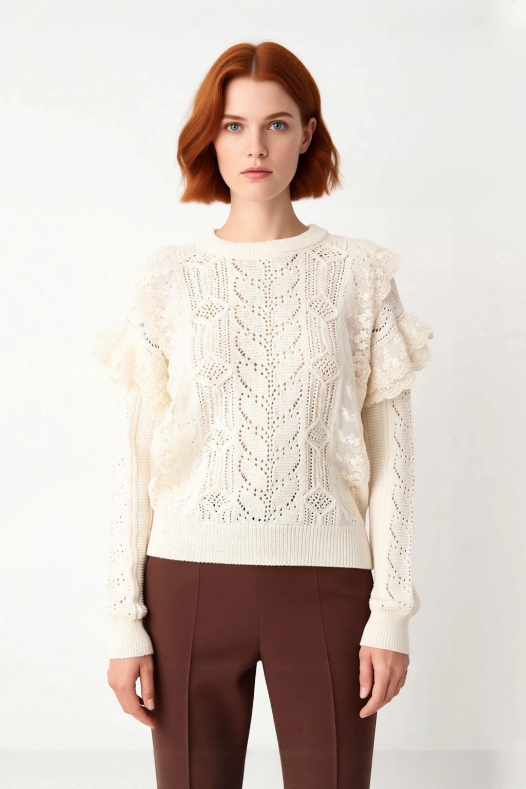 Klasik bisiklet yaka tasarımı, zamansız bir şıklık sunarken, uzun standart kol yapısı hareket özgürlüğünüzü kısıtlamaz. Kol detaylarındaki fırfırlı dantel işlemeler, kazağa benzersiz ve göz alıcı bir karakter katarken, tek plaka dokuma triko kumaşı cildin nefes almasını sağlar ve terlemeyi önler. Orta kalınlıktaki yapısı, mevsim geçişlerinde ve soğuk kış günlerinde sizi ideal sıcaklıkta tutar. Dayanıklı polyester kumaşı sayesinde uzun süreli kullanıma uygun olan bu ürün, T41 yıkama talimatlarına göre kolayca temizlenebilir, böylece pratik kullanım sunar ve formunu uzun süre korur.