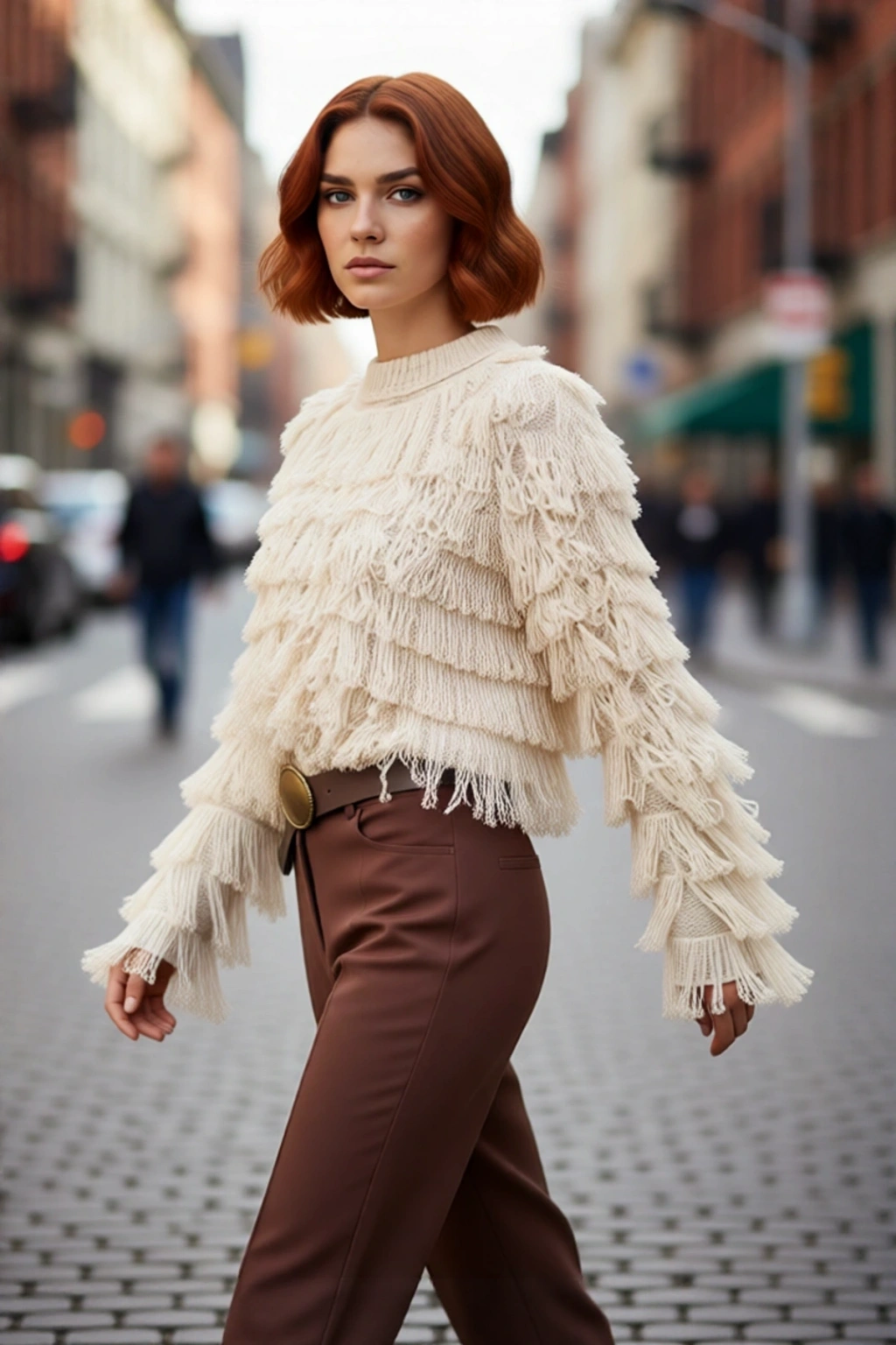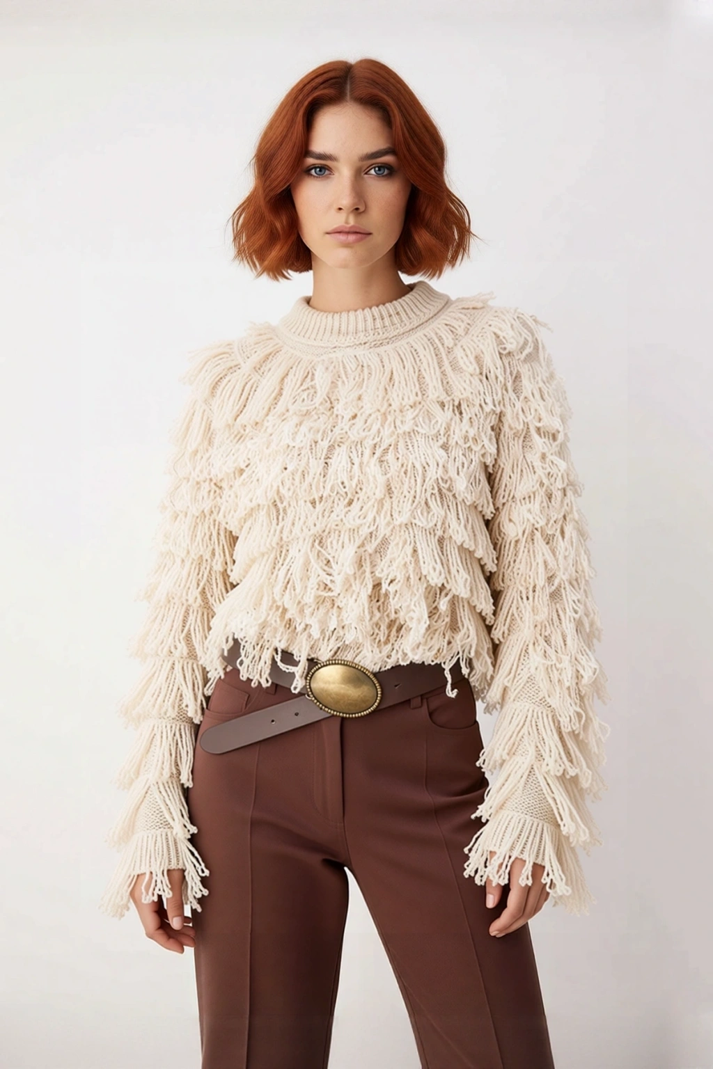 Ürün Özellikleri: Regular kalıp, akrilik ve polyester karışımı materyal, püsküllü dokulu desen, bisiklet yaka, standart kol, triko kumaş, krem renk.