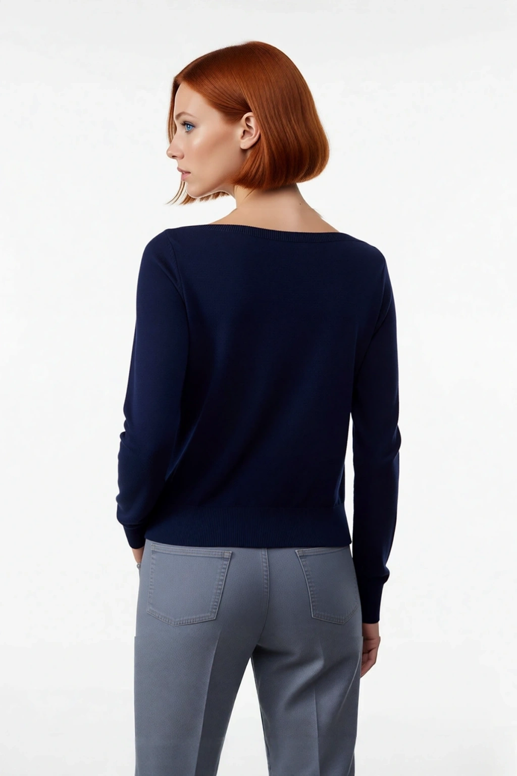 Ürün Özellikleri: Regular kalıp, 51% Viskoz 30% Polyester 19% Poliamid materyal, düz desen, kayık yaka, standart kol, triko kumaş, lacivert renk, crop boy.