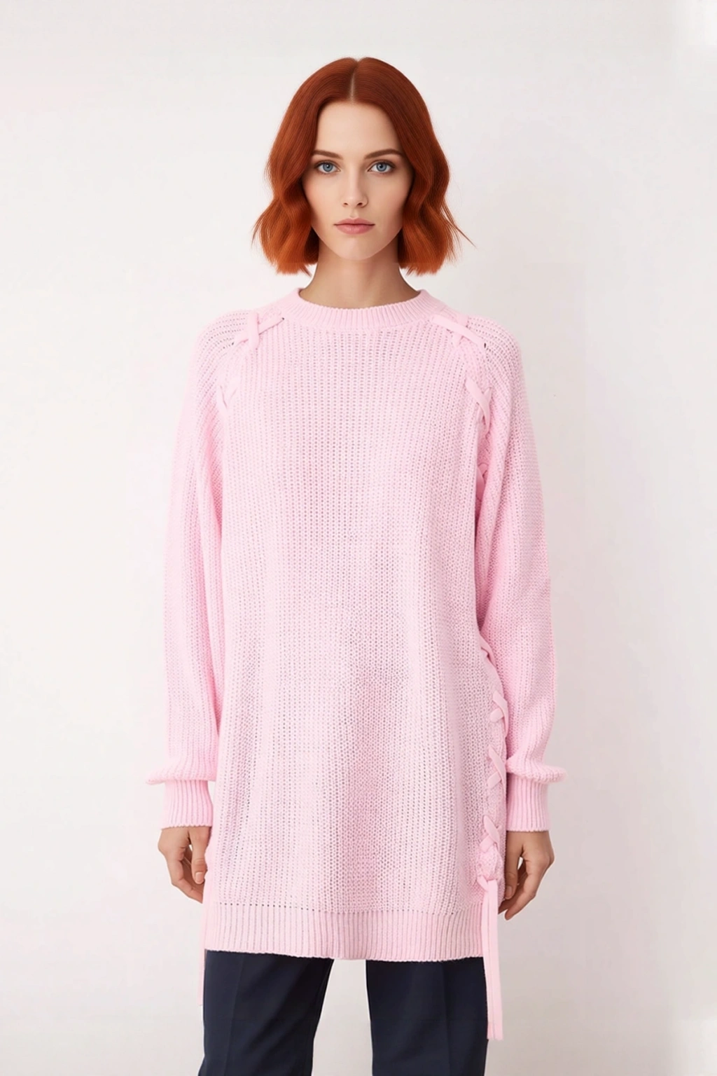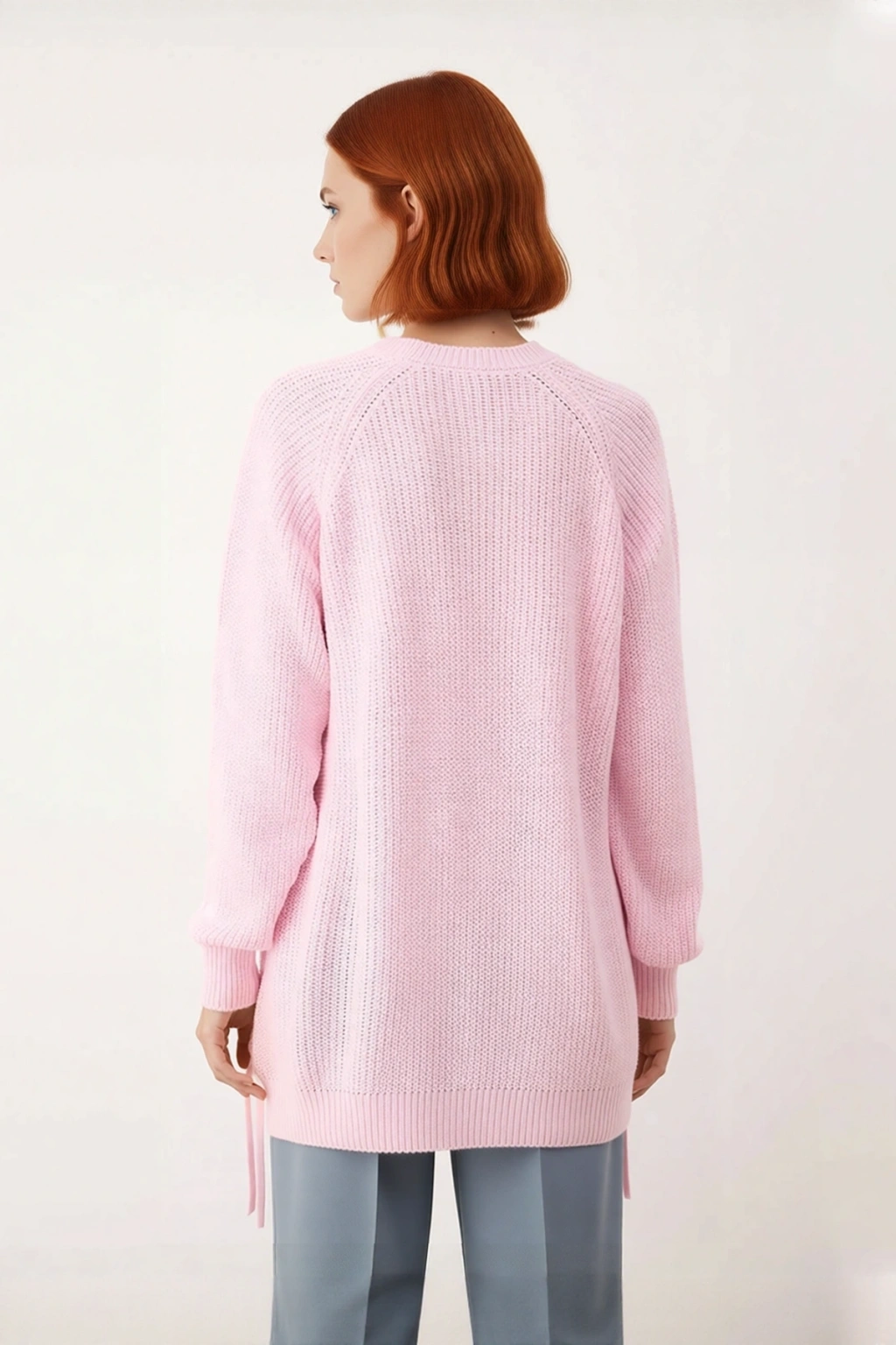 Ürün Özellikleri: Regular kalıp, 100% akrilik materyal, düz desen (örgü detaylı), bisiklet yaka, reglan kol, selanik triko kumaş, pembe renk.