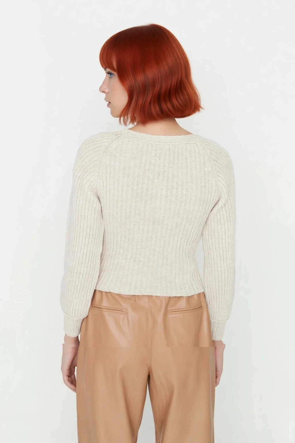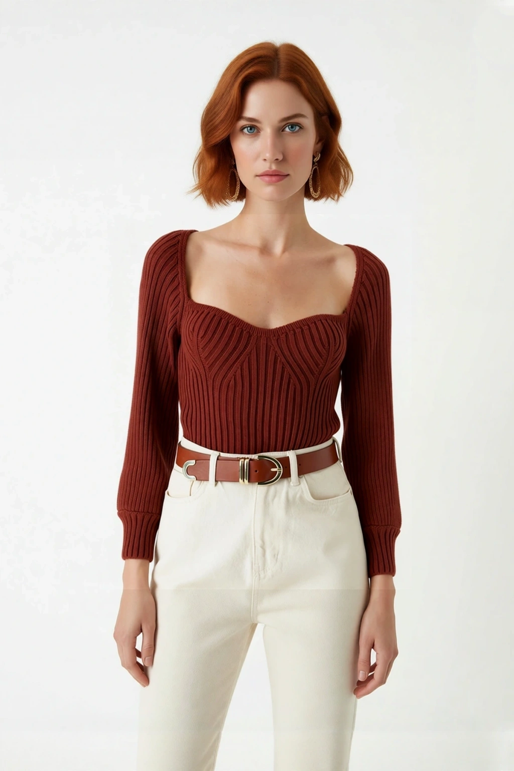 Ürün Özellikleri: Regular kalıp, akrilik materyal, düz desen, kalp yaka, standart kol, triko kumaş, kahverengi renk, crop boy, cepsiz tasarım, fitilli dokuma.