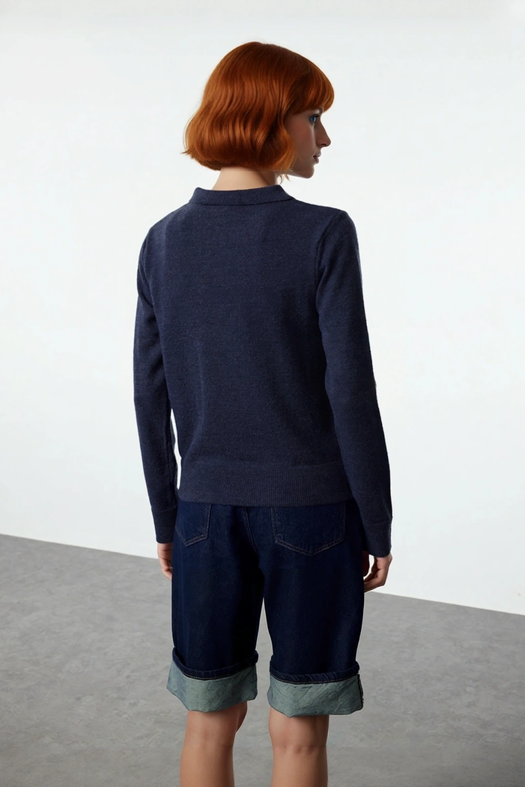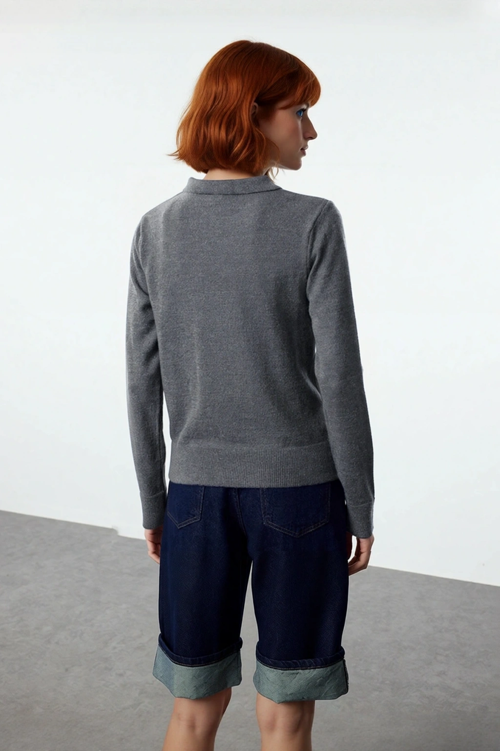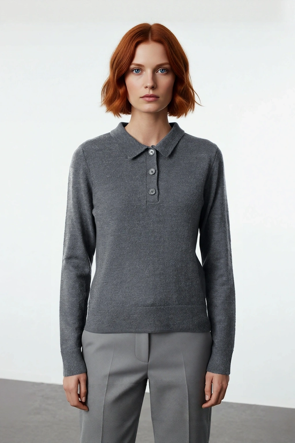Ürün Özellikleri: Regular kalıp, yünlü materyal, düz desen, polo yaka, uzun kol, triko kumaş, gri renk.