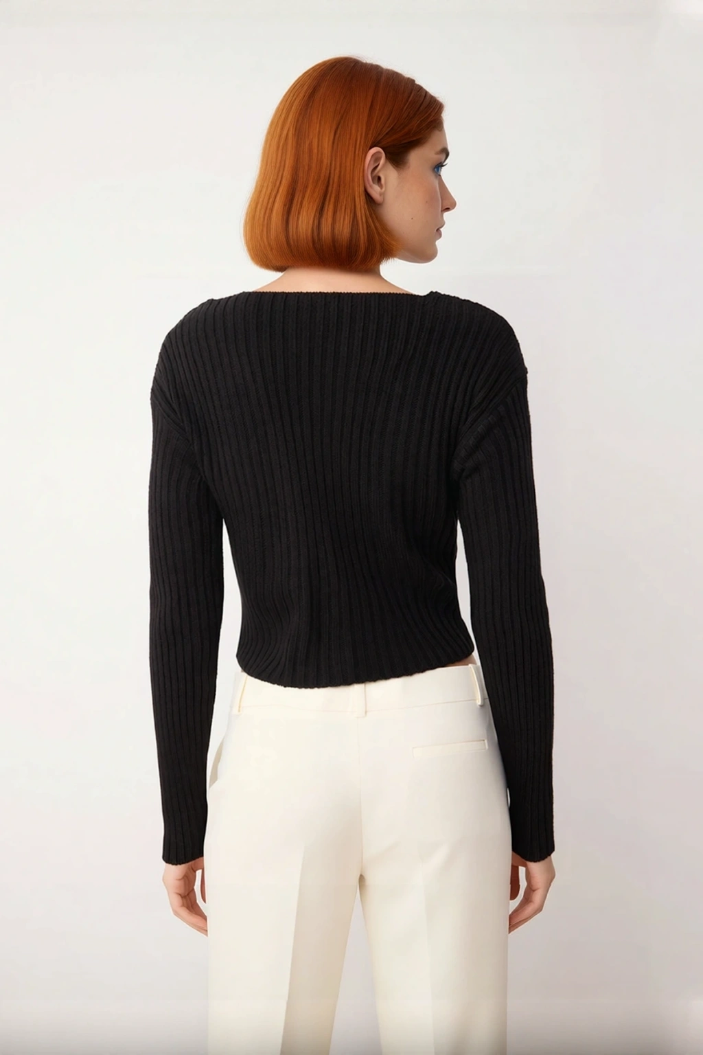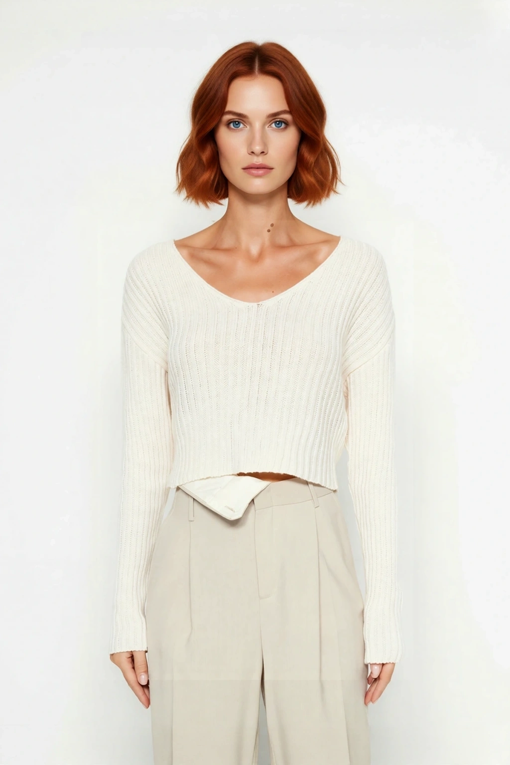 Ürün Özellikleri: Regular kalıp, akrilik materyal, düz desen, V yaka, standart kol, triko kumaş, ekru renk, crop boy.