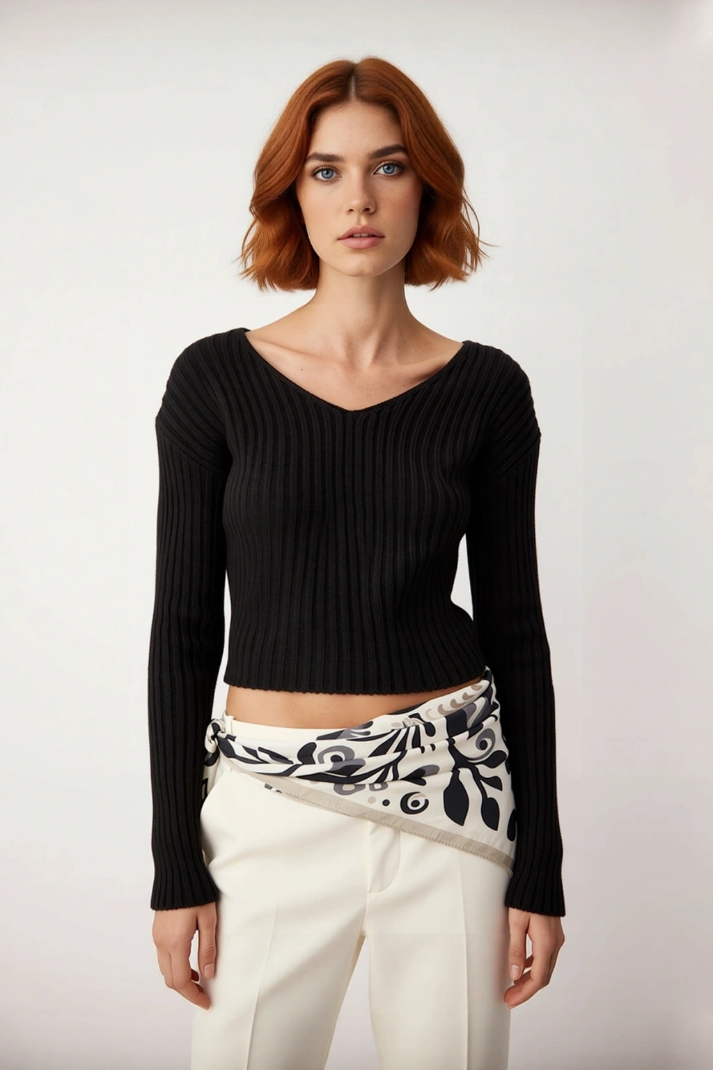 Triko kumaş tipine sahip bu kazak, belirgin fitilli dokuma özelliğiyle hem göz alıcı bir estetik sunar hem de esnek yapısıyla gün boyu üstün hareket özgürlüğü sağlar. Zarif V yaka tasarımı boynunuzu şıkça vurgularken, standart uzun kolları rahat bir kullanım vadeder. İnce kalınlığı sayesinde katmanlı giyim için mükemmel bir seçenek olup, kış sezonunun yanı sıra sonbahar ve ilkbahar aylarında da rahatlıkla tercih edilebilir. Doğru bakım talimatlarına (T41) uygun yıkandığında, uzun süre ilk günkü formunu ve canlı rengini korur. Türkiye menşei garantisiyle kalitesi tescillenmiştir.