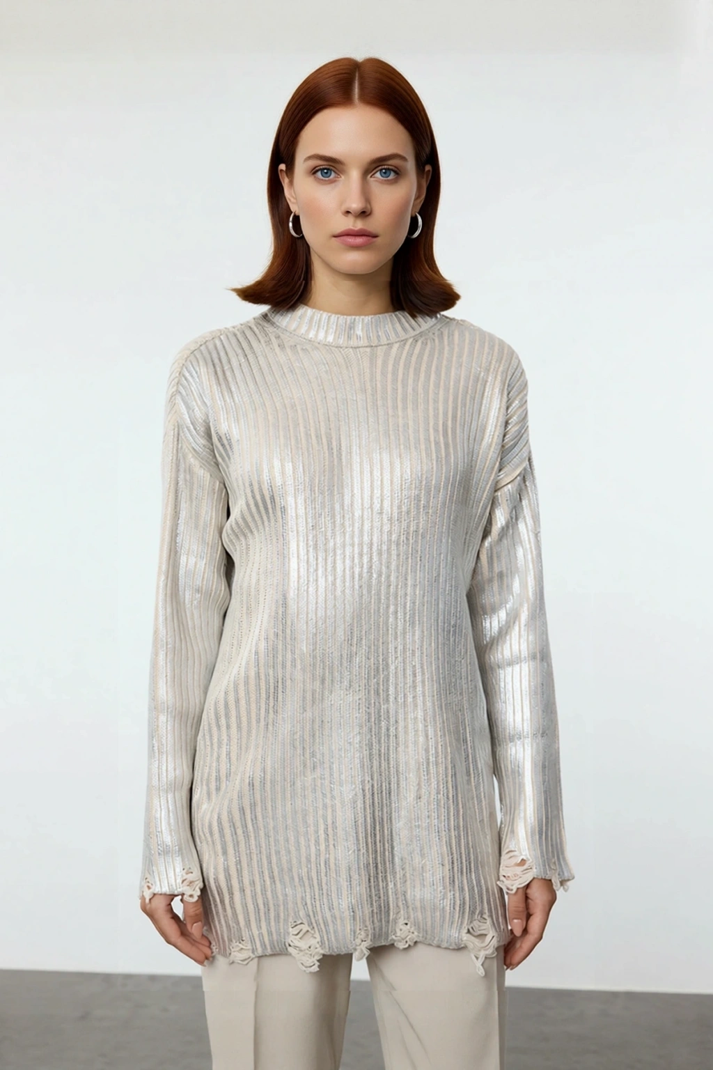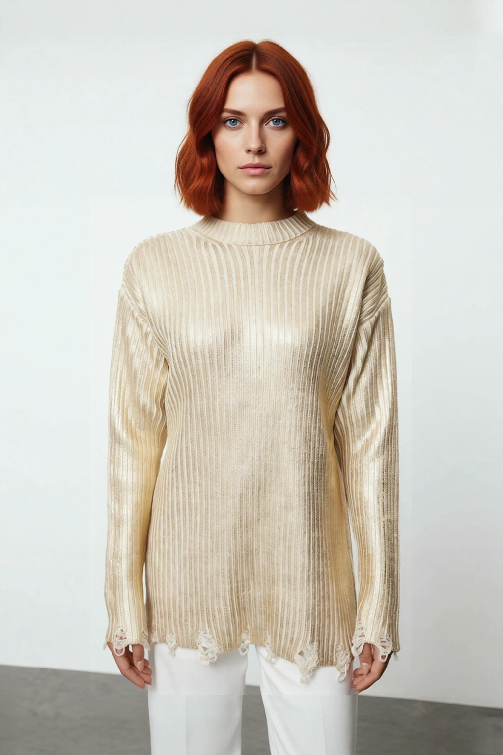 Bu Kadın Relaxed Kalıp Bisiklet Yaka Triko Kazak, ışıltılı altın rengi ve modern ribana dokusuyla gardırobunuzun vazgeçilmezi olmaya aday. Rahat relaxed kalıbı sayesinde gün boyu sınırsız konfor sunarken, yüksek kaliteli %100 akrilik materyali soğuk ve serin havalarda sizi sıcacık tutma özelliğiyle öne çıkar. Düz deseni ve göz alıcı parlaklığıyla sade şıklığı feminen bir dokunuşla birleştirerek modern bir görünüm sağlar. Alt kısmındaki ve kol manşetlerindeki yıpranmış, püsküllü detaylar kazaka benzersiz ve karakterli bir hava katarken, basic siluetiyle zahmetsizce kolay kombinlenebilirlik sunar. Bu parça, hem rahatlığı hem de sofistike tarzı bir araya getiriyor.