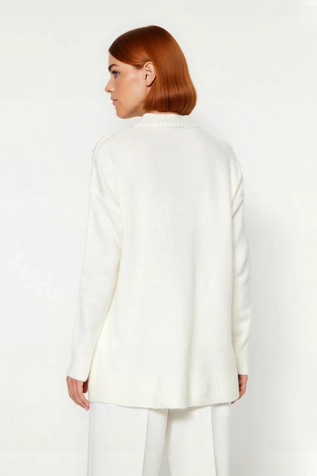 Ürün Özellikleri: Relaxed kalıp, akrilik polyester elastan karışımı materyal, düz incili desen, bisiklet yaka, balon kol, triko kumaş, ekru renk.