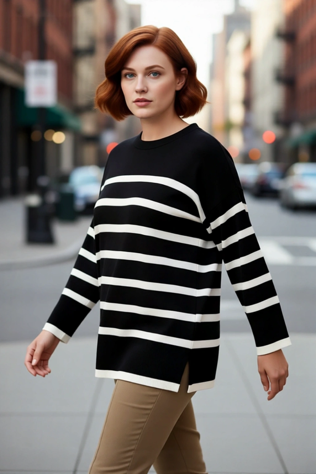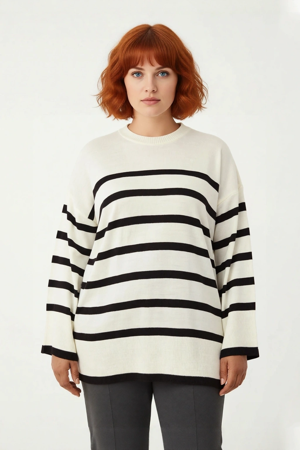 Bu kadın triko kazak, relaxed kalıbı ile gün boyu süren eşsiz bir rahatlık ve modern şık bir görünümü bir arada sunar. Yüksek kaliteli akrilik materyalden özenle üretilmiş olması sayesinde kış aylarının soğuk günlerinde üstün sıcaklık ve teninize dost, yumuşak bir dokunuş hissi verir. Zamansız çizgili deseni, ekru zemin üzerine siyah şeritlerle dinamik ve modern bir dokunuş katarken, baskısız tasarımı sade ve sofistike bir estetik sunar. Casual ve günlük kullanım için ideal olan bu özel parça, gardırobunuzun vazgeçilmez ve en sevilenleri arasına girmeye adaydır, her anınızda size eşlik eder.