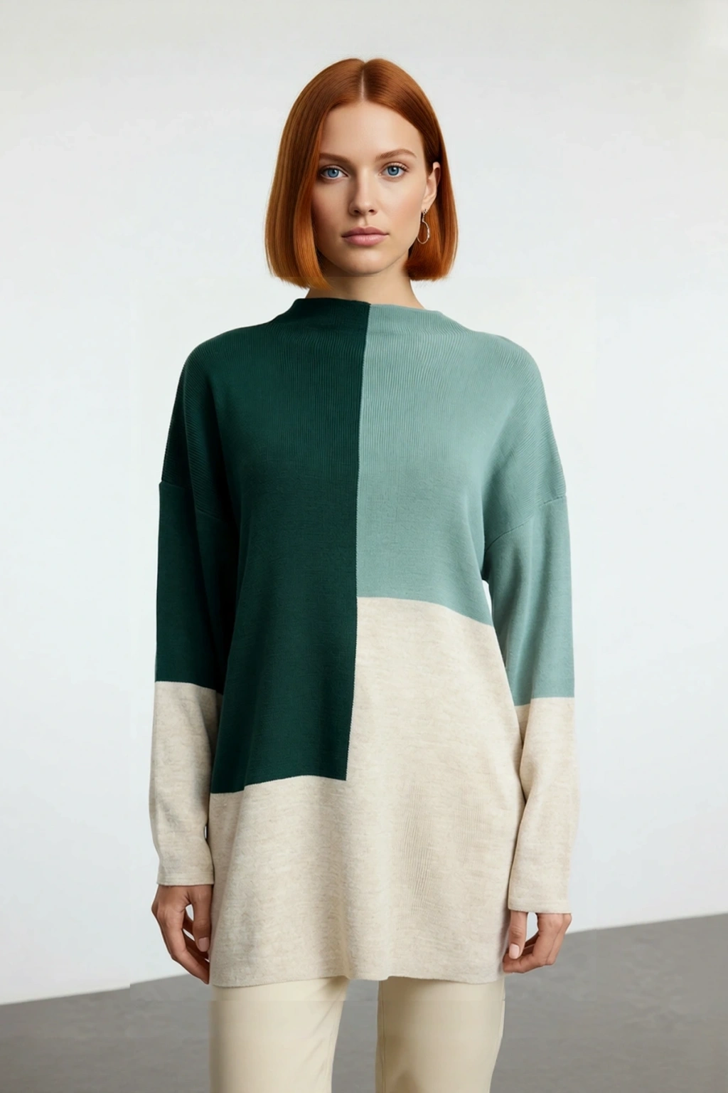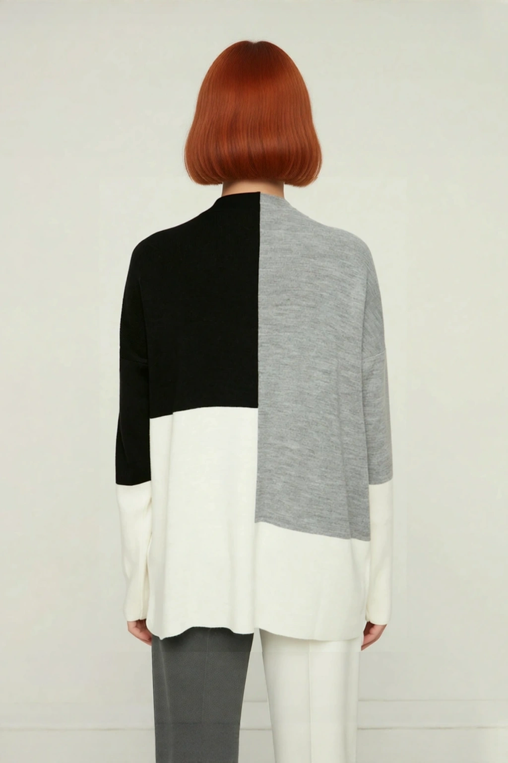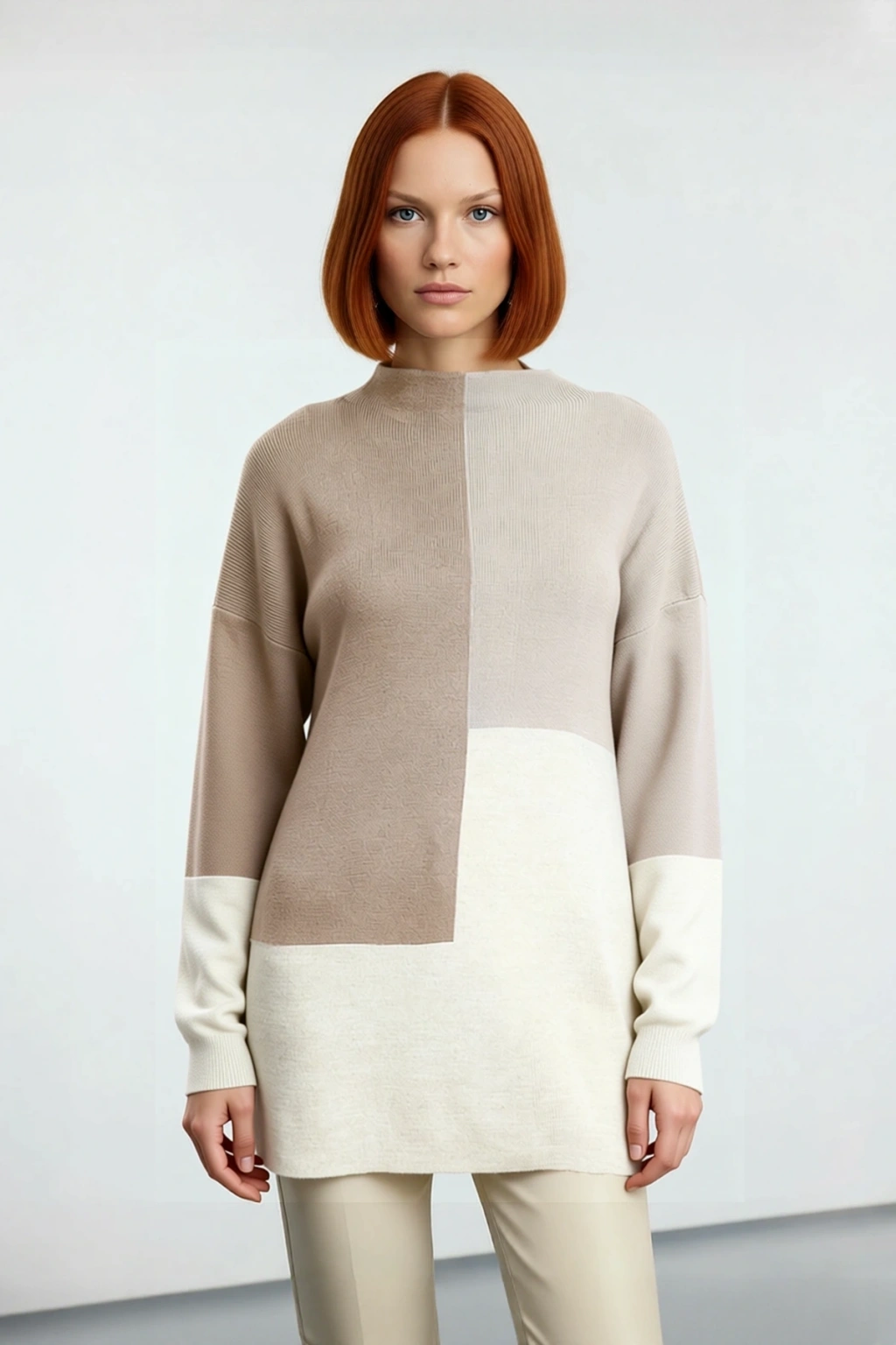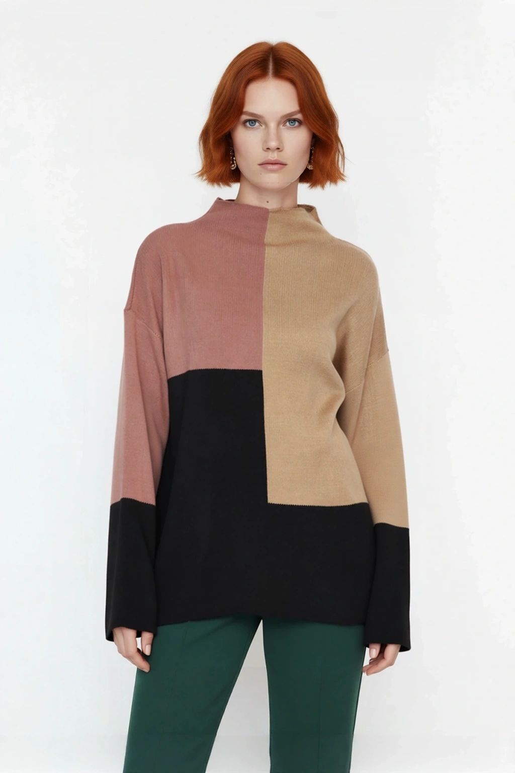 Ürün Özellikleri: Relaxed kalıp, akrilik materyal, renk bloklu desen, dik yaka, standart kol, triko kumaş, kahverengi renk, cepsiz tasarım.