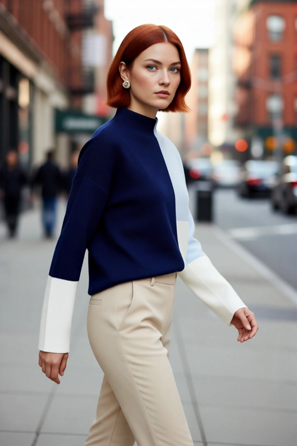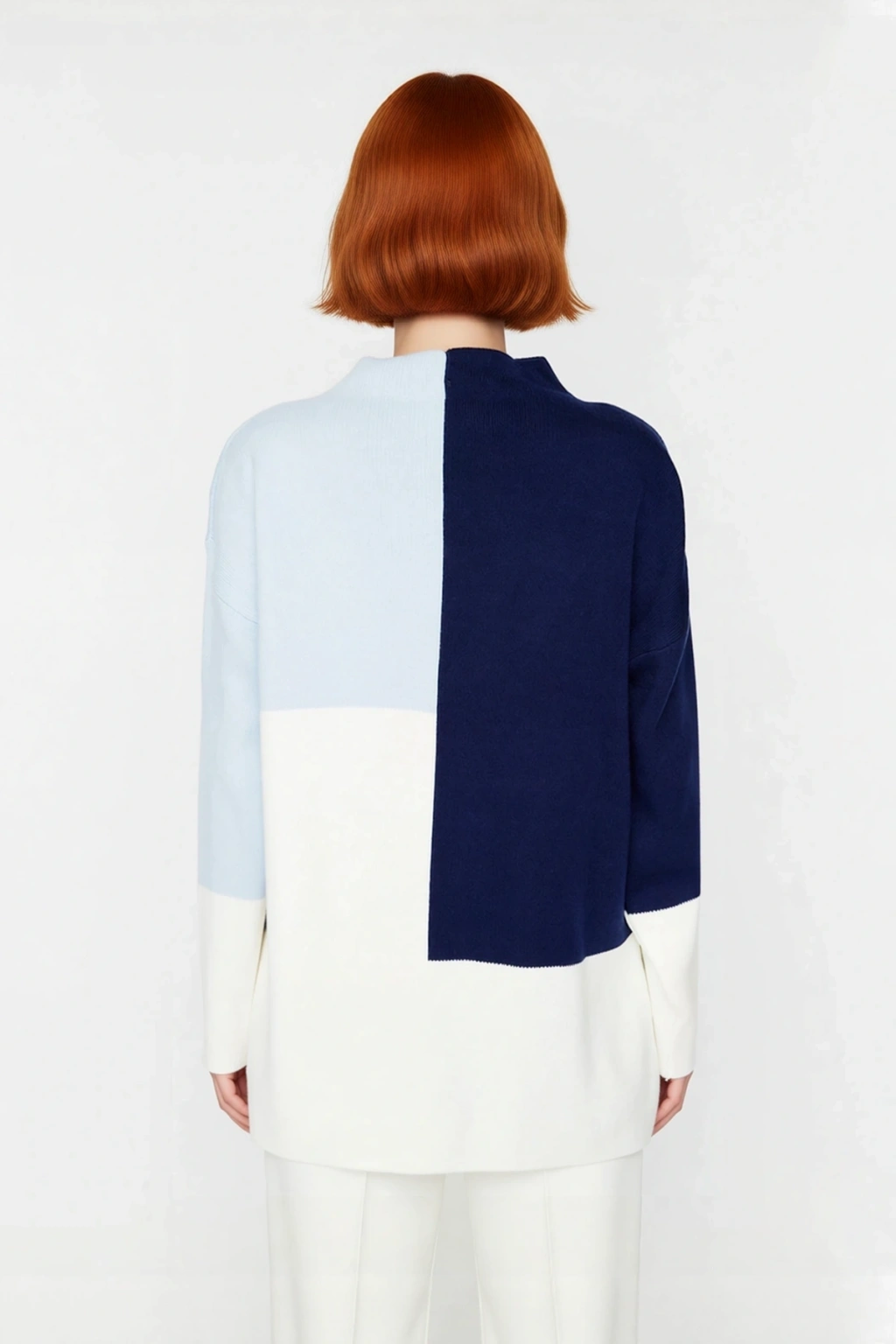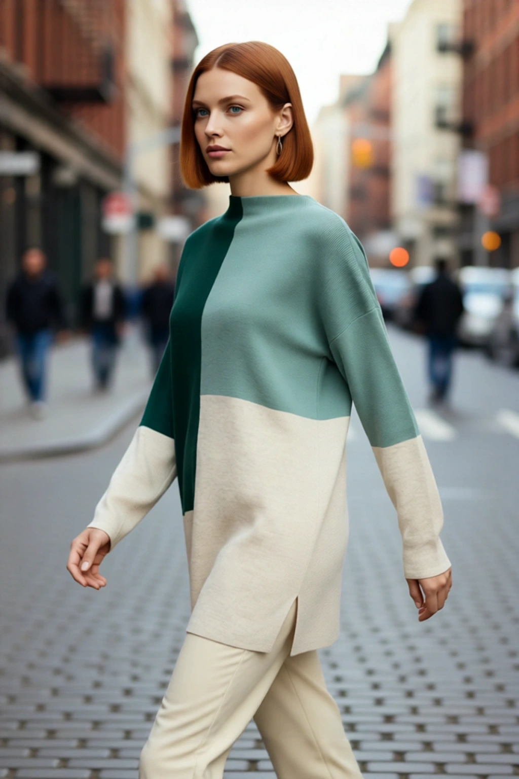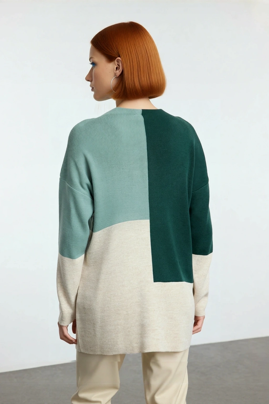 Ürün Özellikleri: Relaxed kalıp, akrilik materyal, renk bloklu desen, dik yaka, standart kol, triko kumaş, kahverengi renk, cepsiz tasarım.