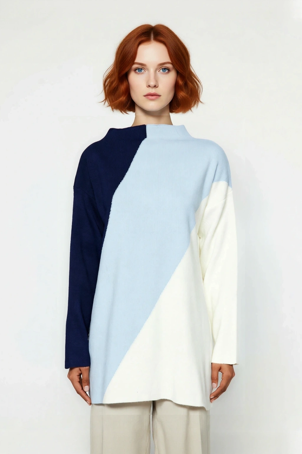 Ürün Özellikleri: Relaxed kalıp, 100% akrilik materyal, renk bloklu desen, dik yaka, düşük kol, triko kumaş, lacivert/açık mavi/krem renk.