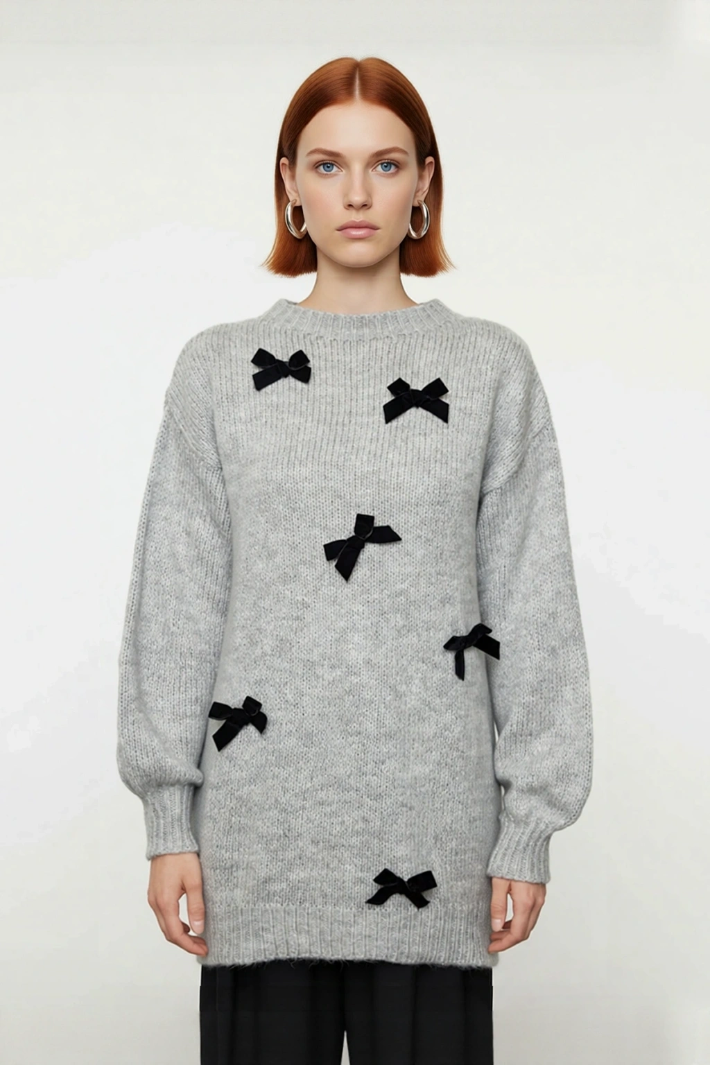 Ürün Özellikleri: Relaxed kalıp, %75 akrilik %25 polyester materyal, düz desen, bisiklet yaka, düşük kol, triko kumaş, gri renk, fiyonklu tasarım.