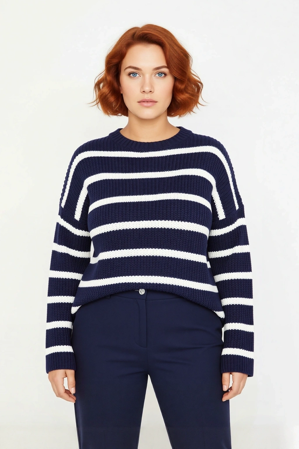 Ürün Özellikleri: Relaxed kalıp, akrilik materyal, çizgili desen, bisiklet yaka, düşük kol, triko kumaş, lacivert renk.