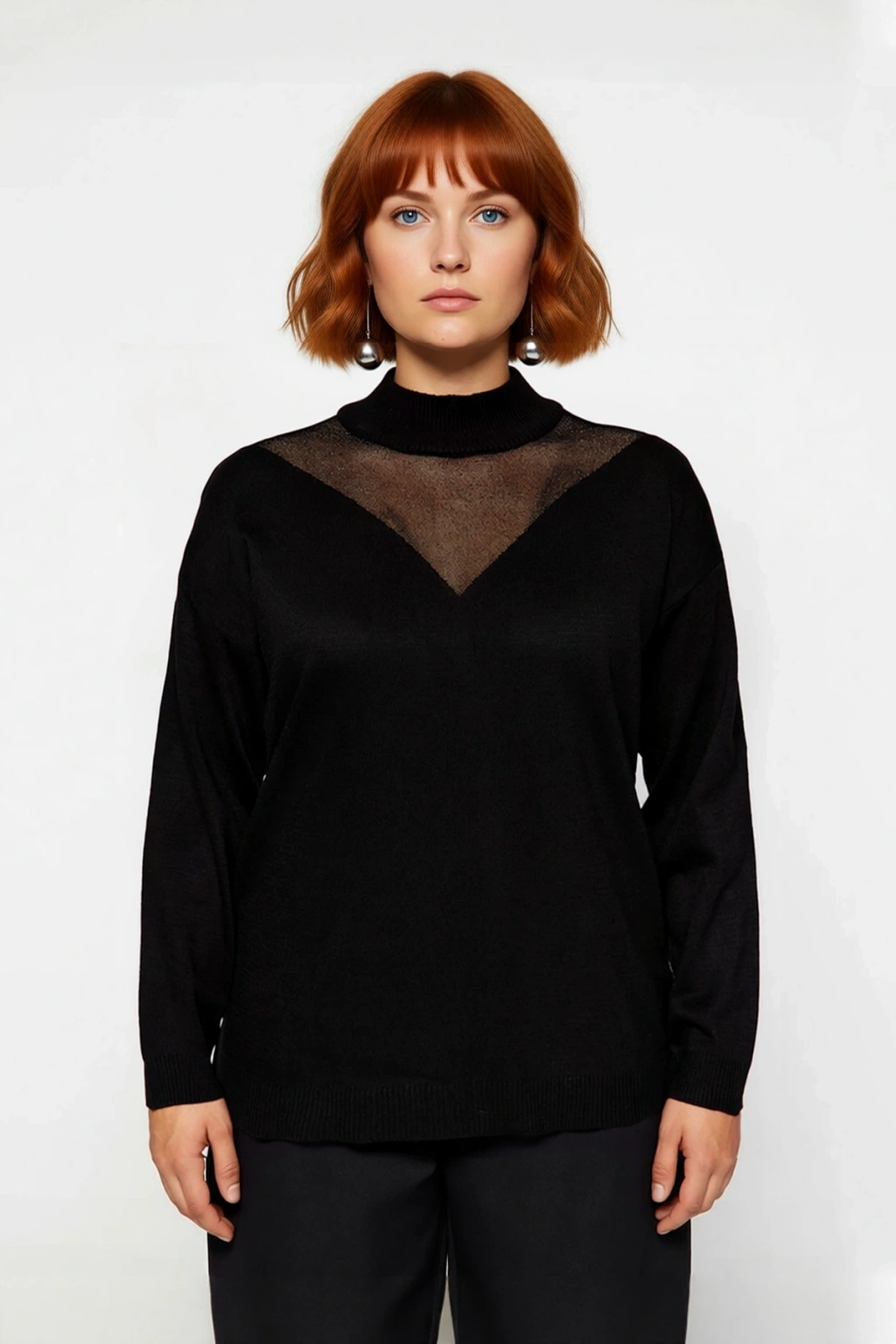 Dik yaka tasarımı, boynunuzu nazikçe sararak şık bir duruş sergilerken, standart uzun kol yapısı mevsim geçişlerinde sıcak tutar. İnce dokuma tipine sahip tek plaka triko kumaşı, nefes alabilen yapısıyla gün boyu konfor sunar ve hafifliği sayesinde katmanlı giyime olanak tanır. Materyal bileşenindeki metalize iplik detayları, tül kısmında zarif bir ışıltı yaratarak ürüne modern bir hava katar. Makinede yıkanabilir özelliği ile bakımı oldukça kolaydır, bu da yoğun tempolu günlerinizde pratik bir kullanım sunar. Cepsiz ve kemersiz sade tasarımı, farklı kombinasyonlara kolayca adapte olur.