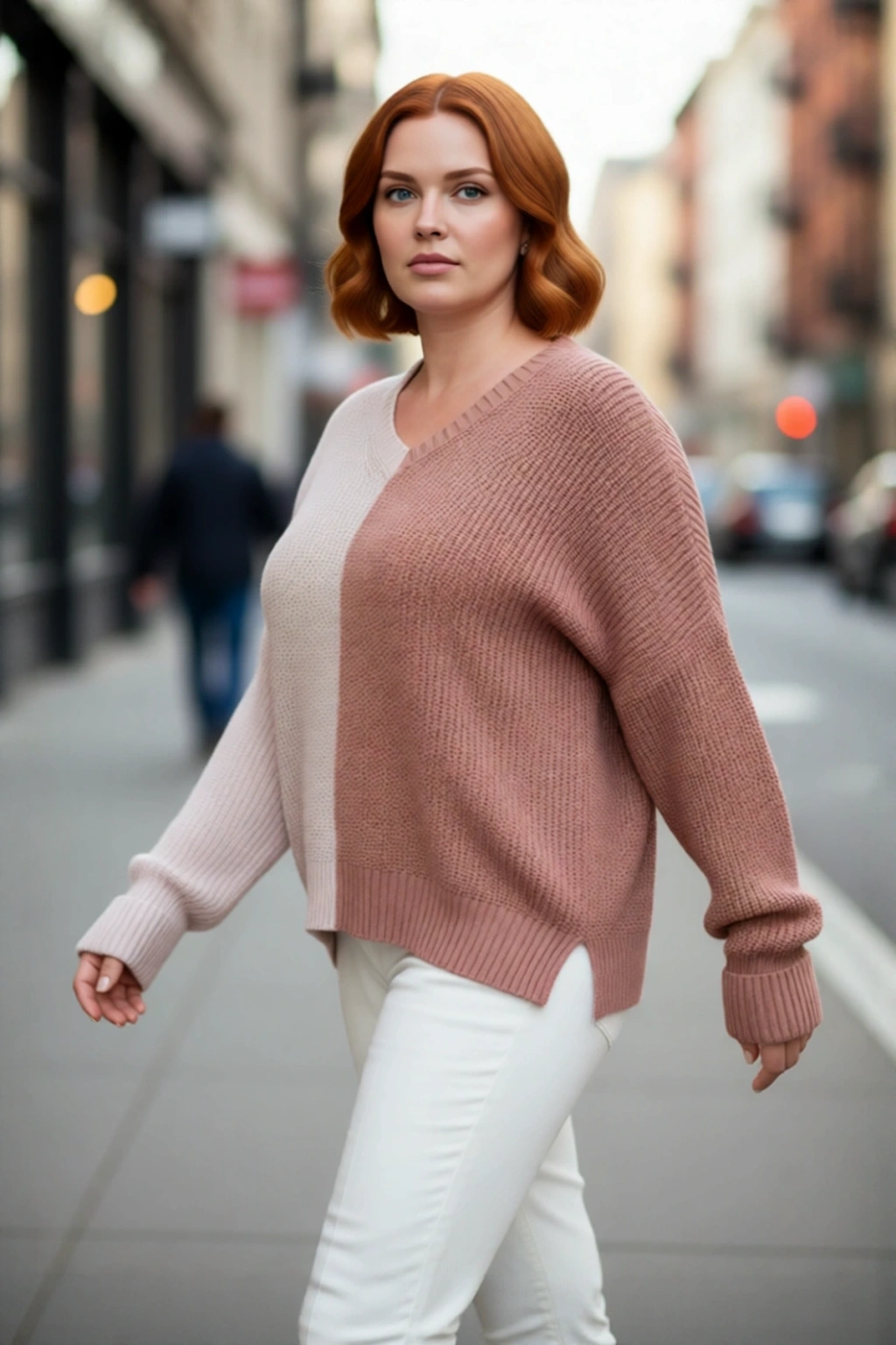 Ürün Özellikleri: Relaxed kalıp, akrilik materyal, renk bloklu desen, v yaka, standart kol, triko kumaş, bej renk, baskısız tasarım.