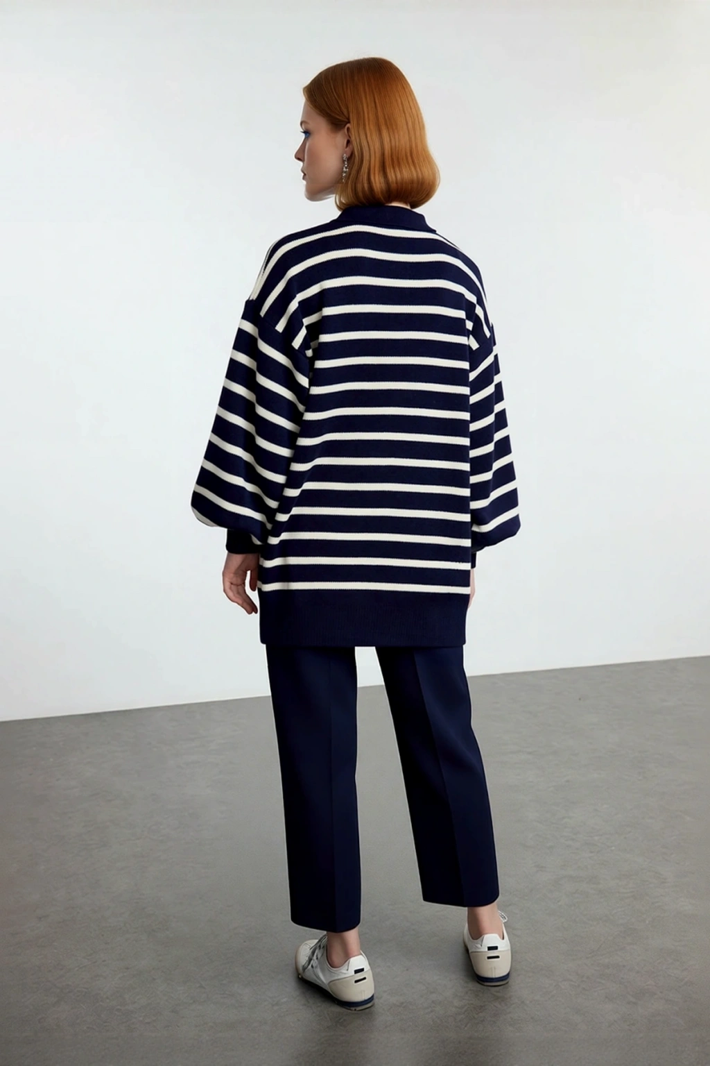 Ürün Özellikleri: Relaxed kalıp, %100 akrilik materyal, çizgili desen, polo yaka, düşük kol, triko kumaş, lacivert renk, cepsiz, kemersiz.